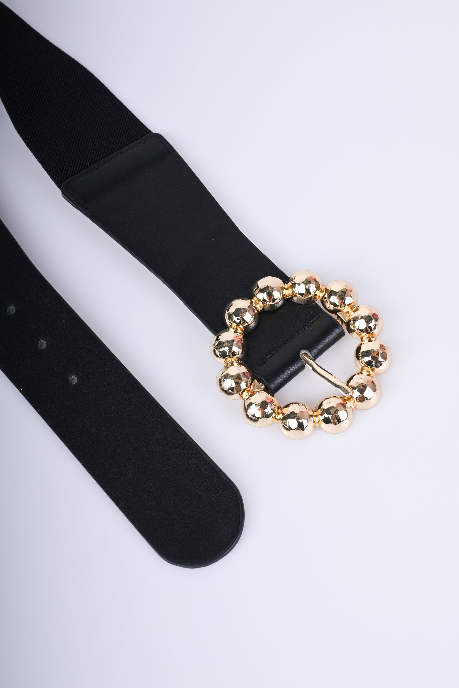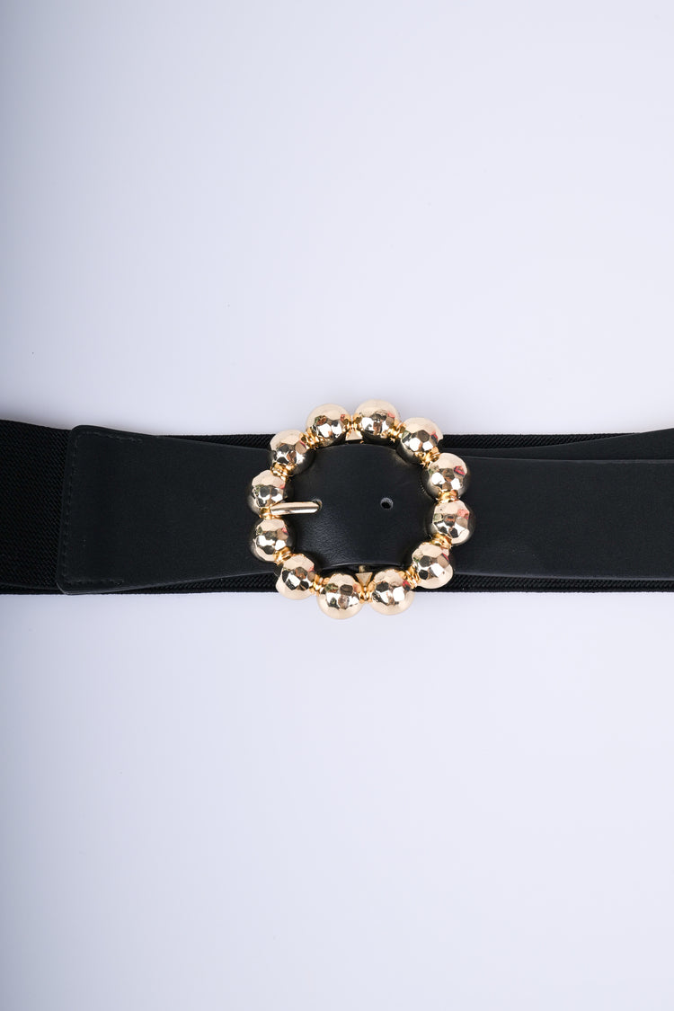 Cintura in similpelle e tessuto elastico nero con fibbia tonda a sfere in metallo dorato.