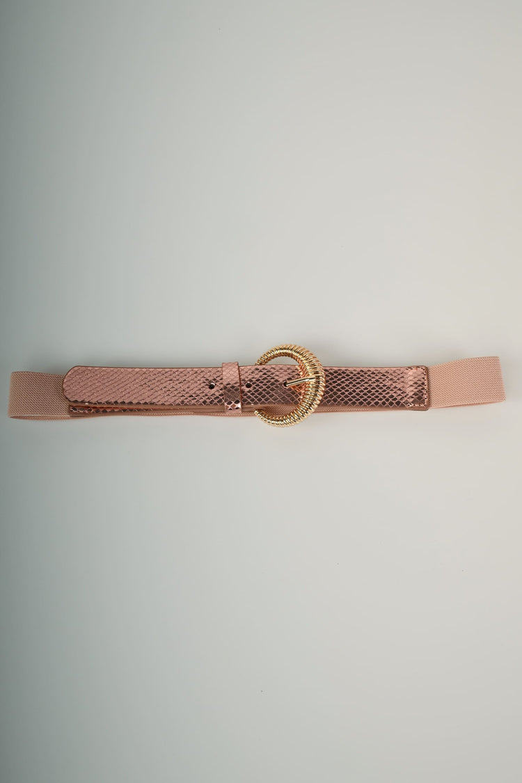 Cintura in tessuto elasticizzato e similpelle lucida effetto pitone rosa con fibbia tonda in metallo dorato.