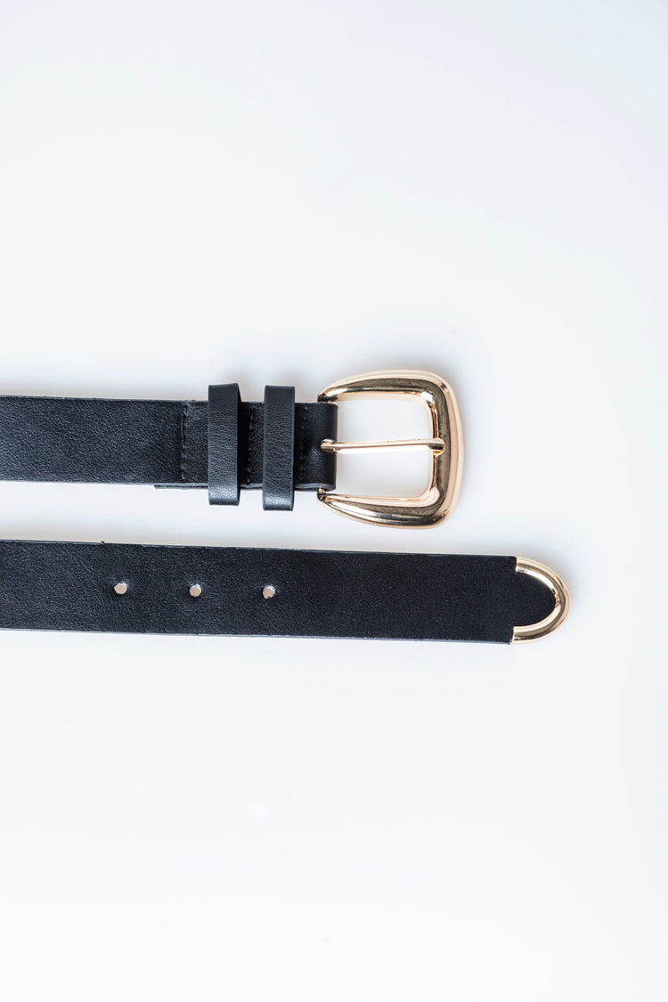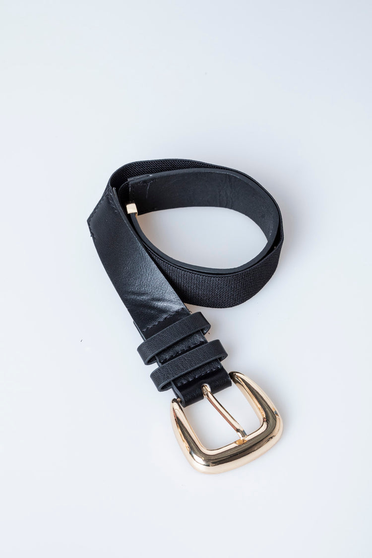Cintura in tela stretch e similpelle nera con fibbia in metallo dorato.