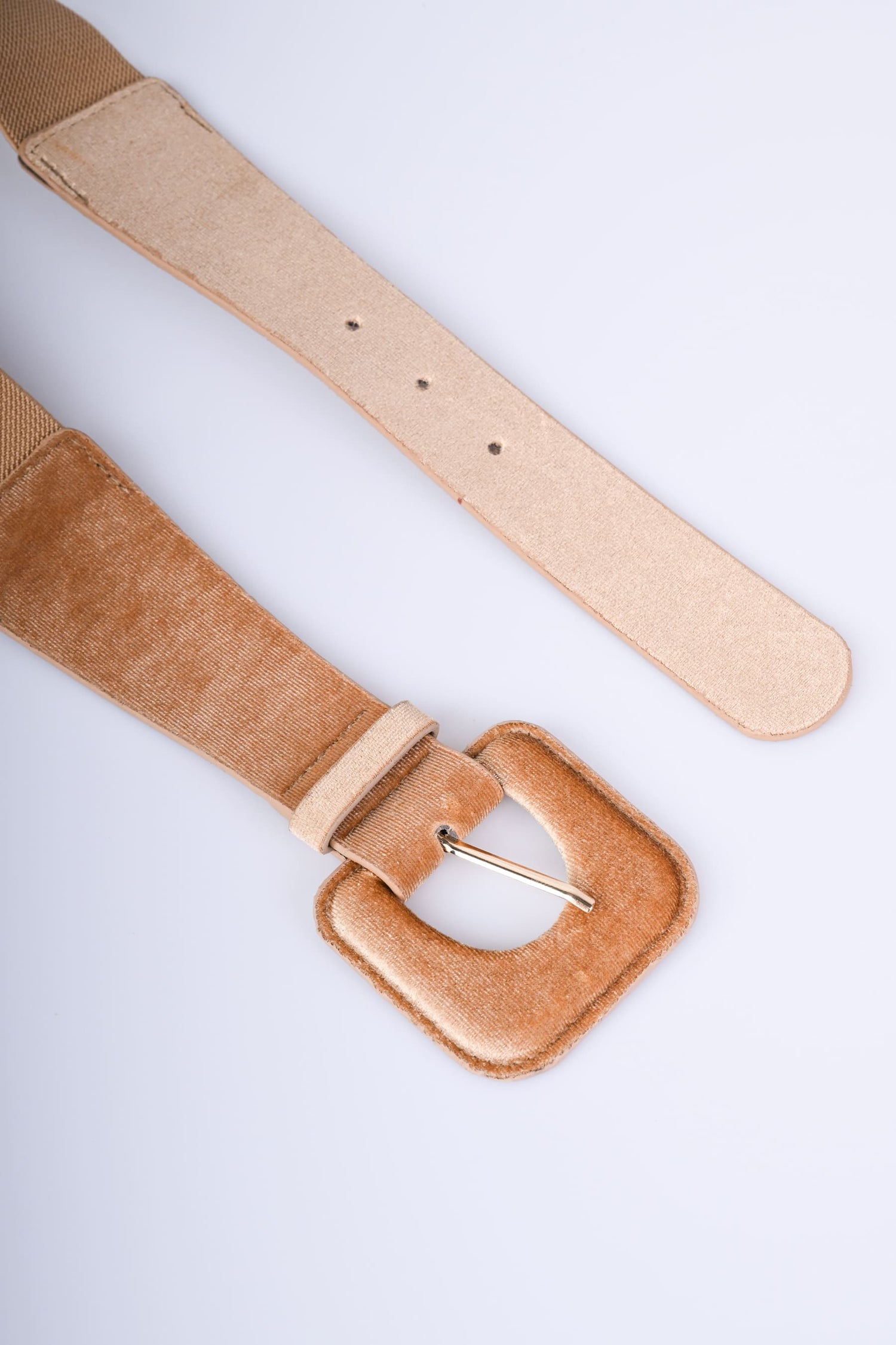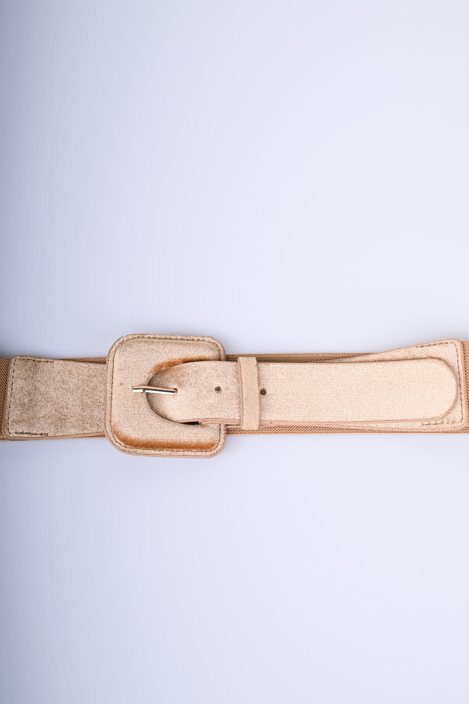 Cintura in tessuto elastico e velluto marrone chiaro con fibbia squadrata e hardware in metallo dorato.
