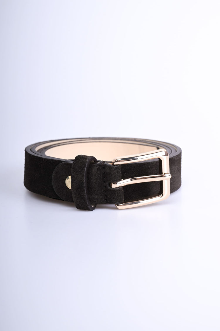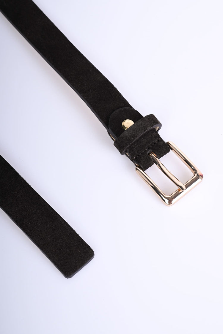 Cintura sottile in pelle scamosciata marrone con fibbia rettangolare e hardware in metallo dorato.