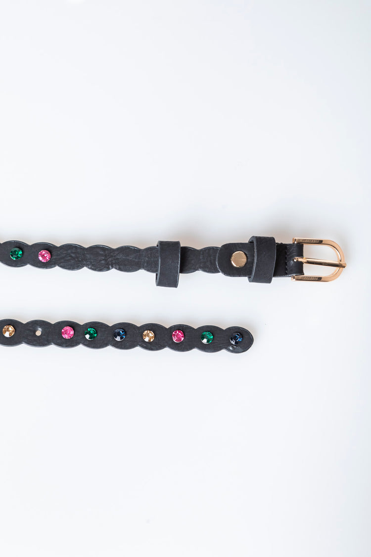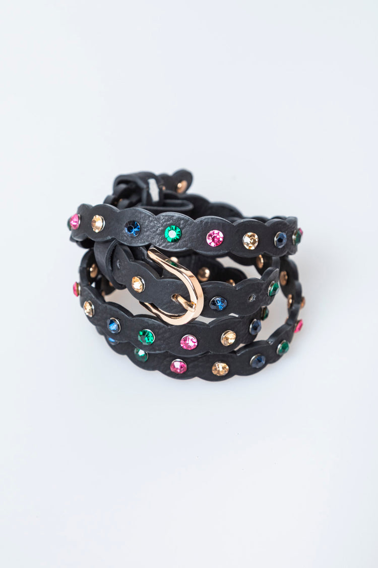 Cintura sottile in similpelle nera con bordi ondulati, strass decorativi multicolor e fibbia in metallo dorato.