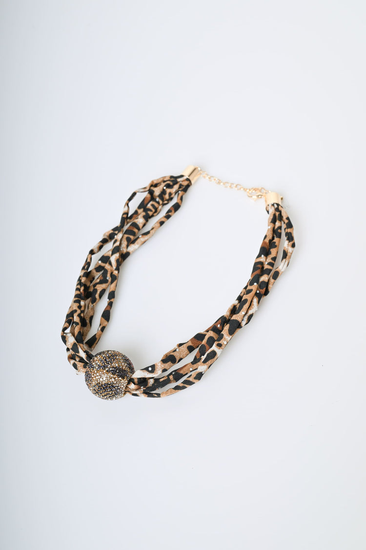 Collana a tre fili in tessuto a stampa leopardata con sfera centrale a stampa animale con strass e chiusura regolabile tramite gancetto sul retro in metallo dorato.