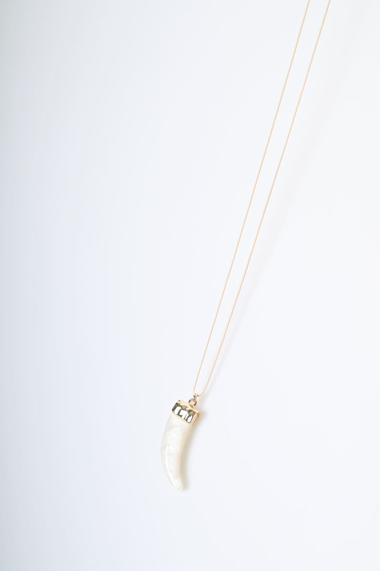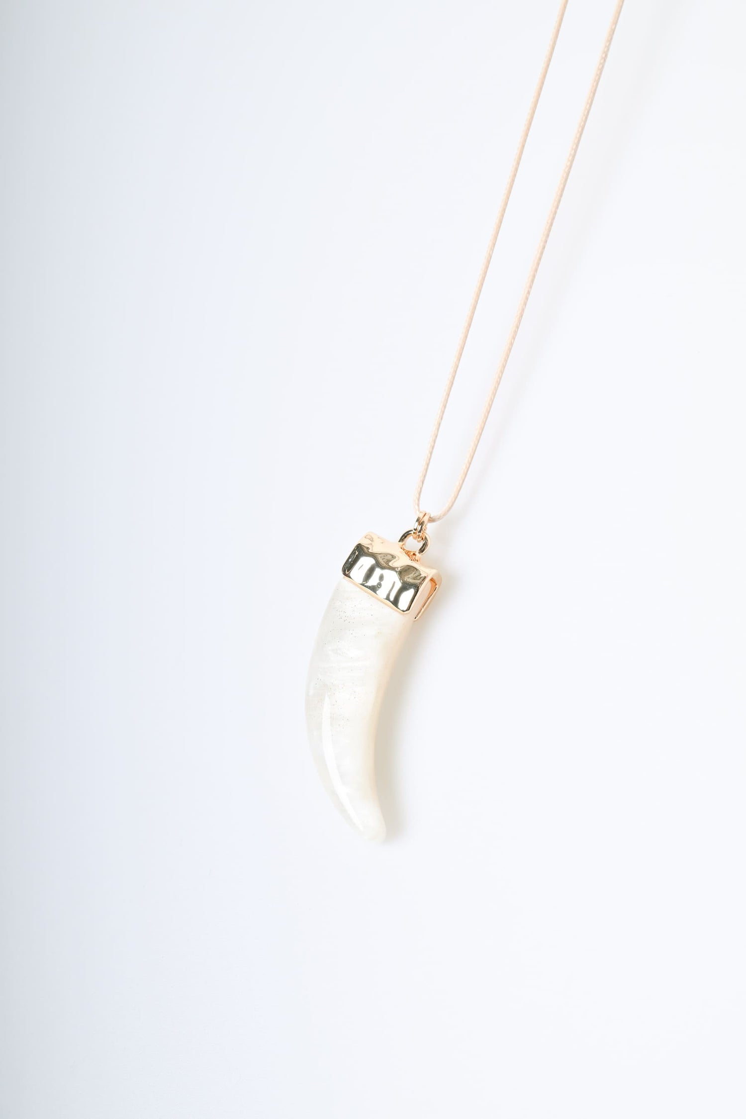 Collana a cordoncino sottile con pendente a corno in metallo dorato e acrilico bianco.