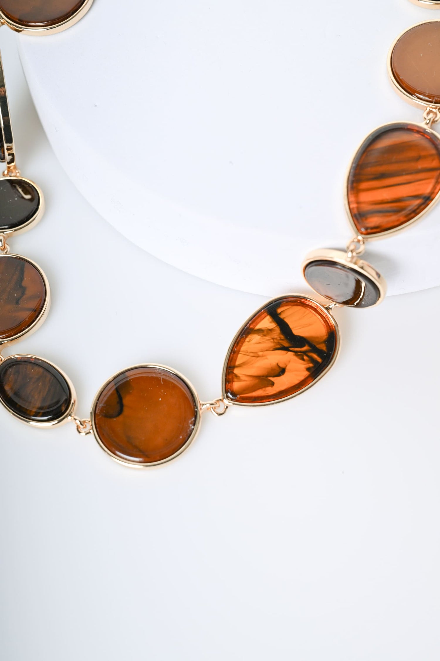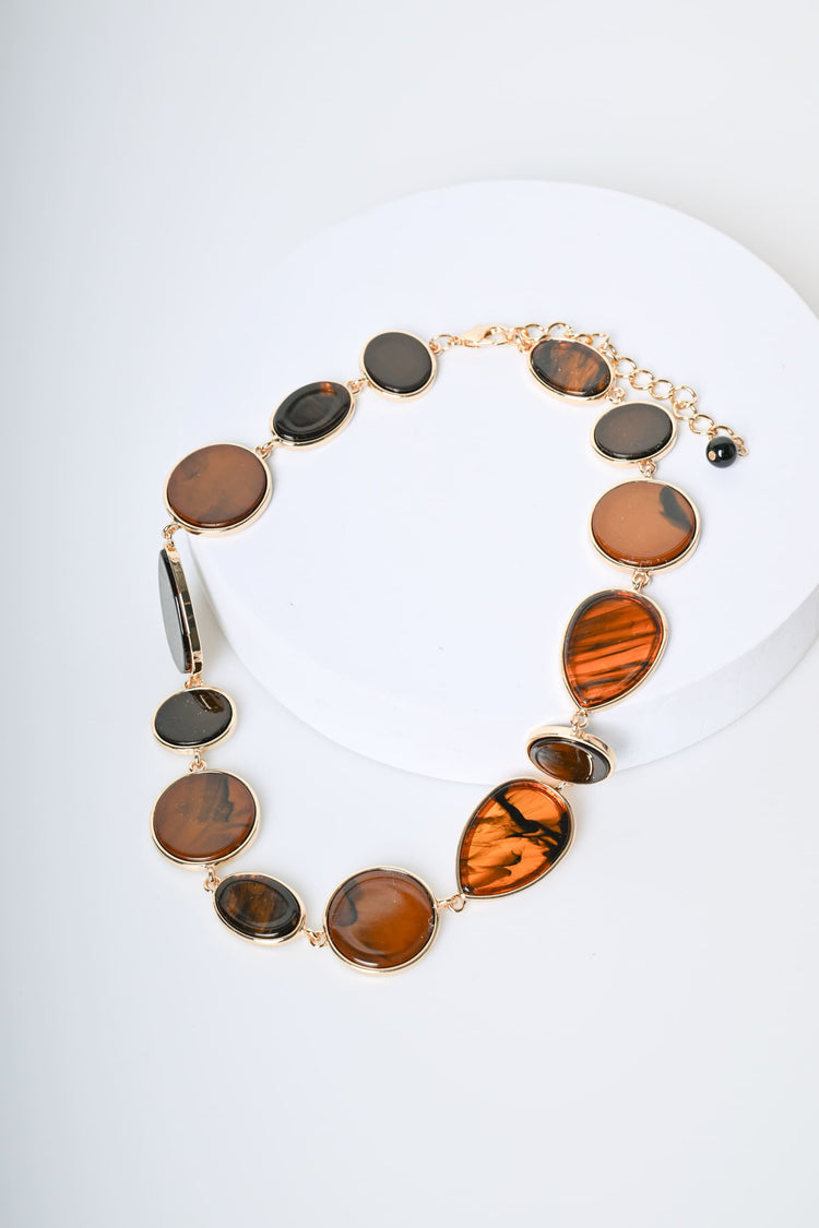 Collana in metallo dorato con pietre irregolari nei toni del marrone ambrato e chiusura regolabile con gancetto.