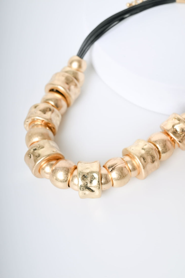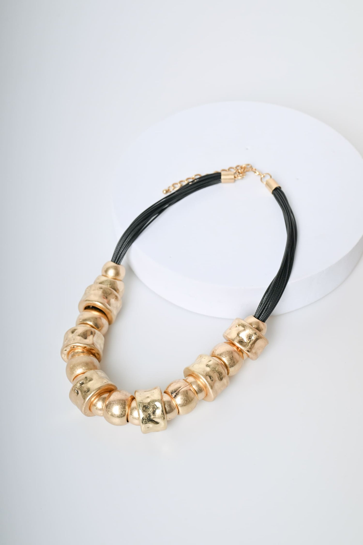 Collana a fili in tessuto nero con anelli chunky in metallo dorato di diverse forme e gancetto regolabile di chiusura sul retro.