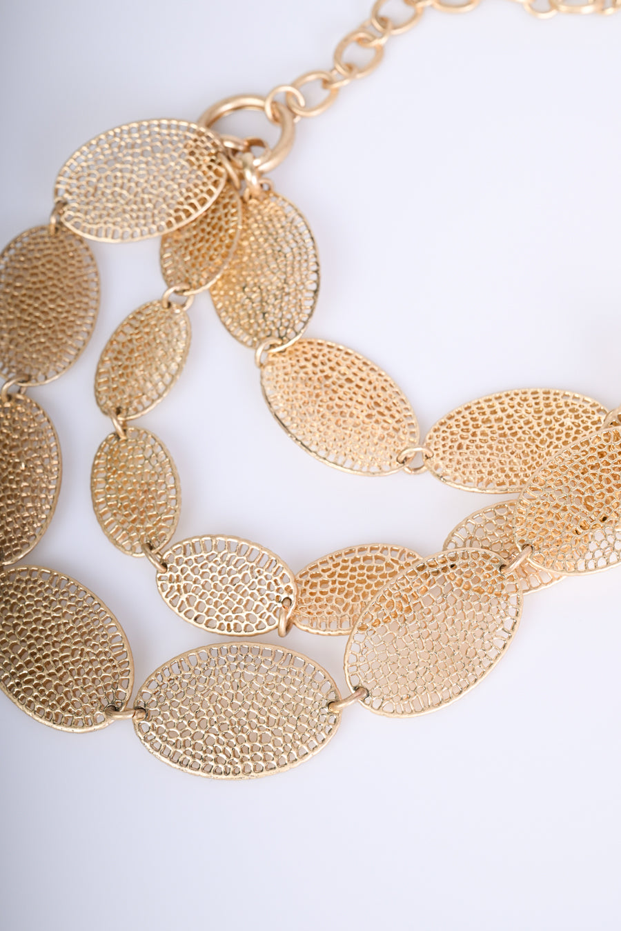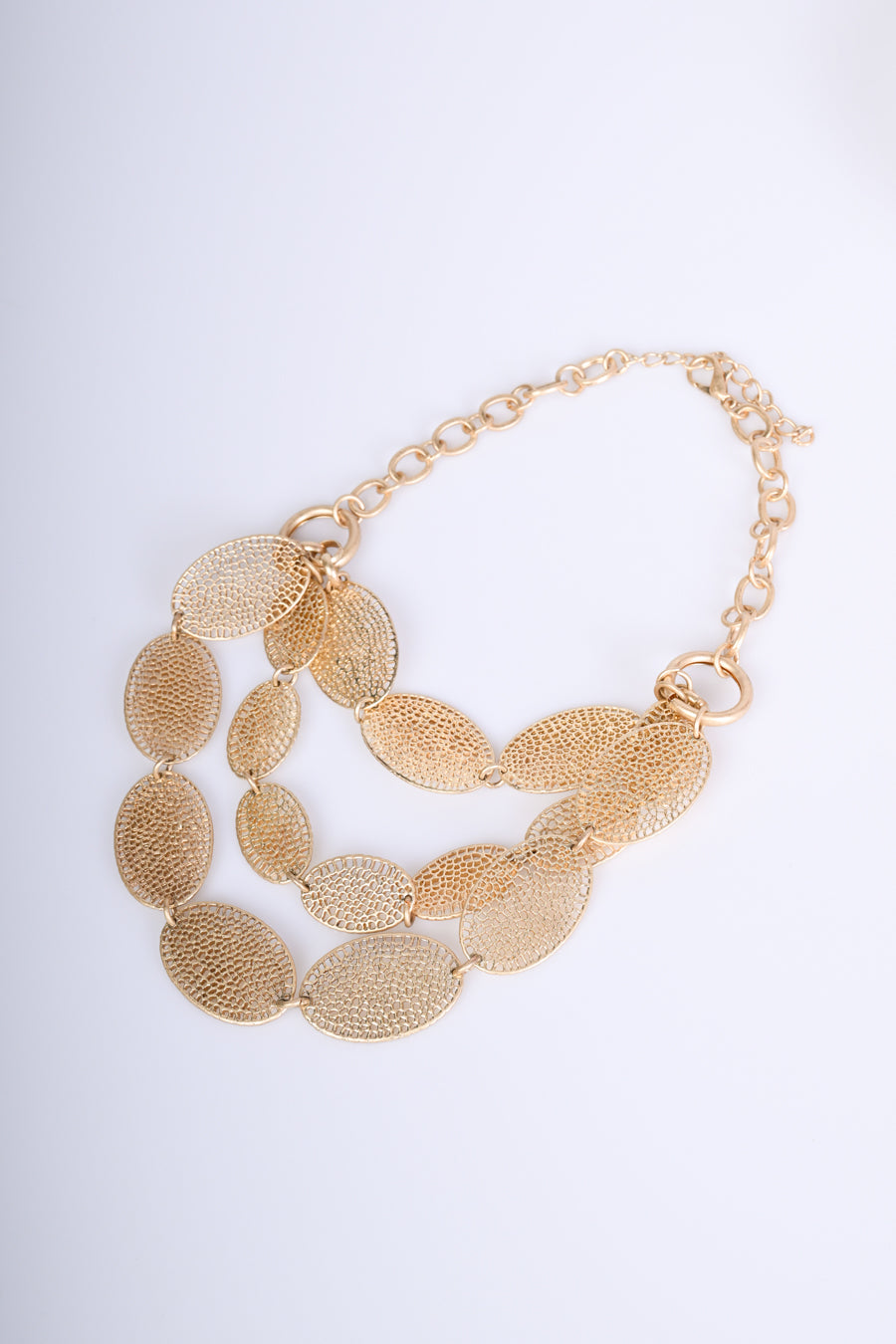 Collana a catenella in metallo dorato con tripla fila di pendenti ovali in filigrana e chiusura regolabile tramite gancetto.