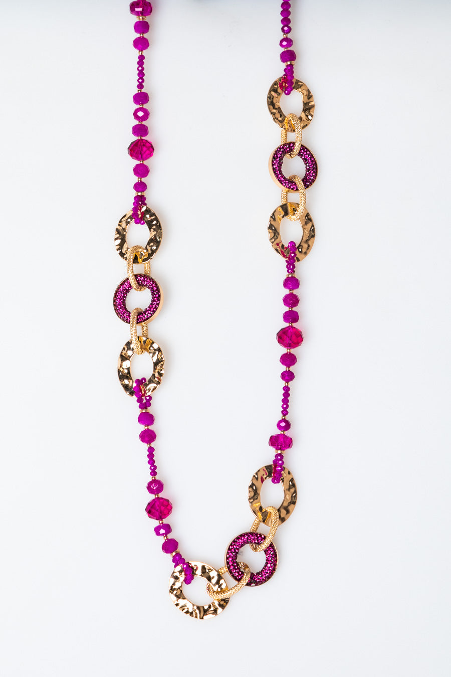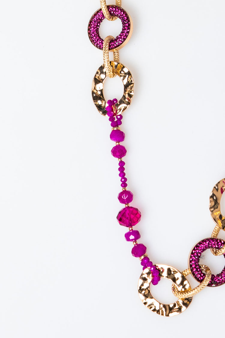 Collana lunga in perline nei toni del fucsia con cerchi decorativi in metallo dorato.
