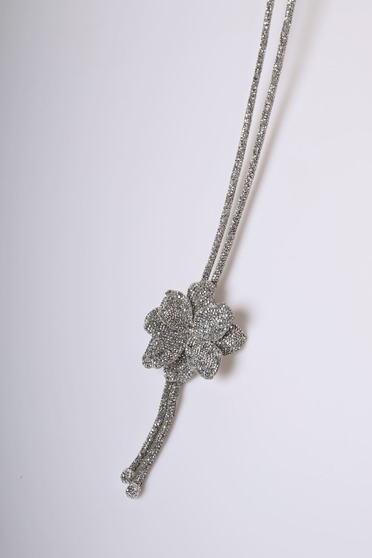 Collana lunga in strass argentati con fiore decorativo centrale.