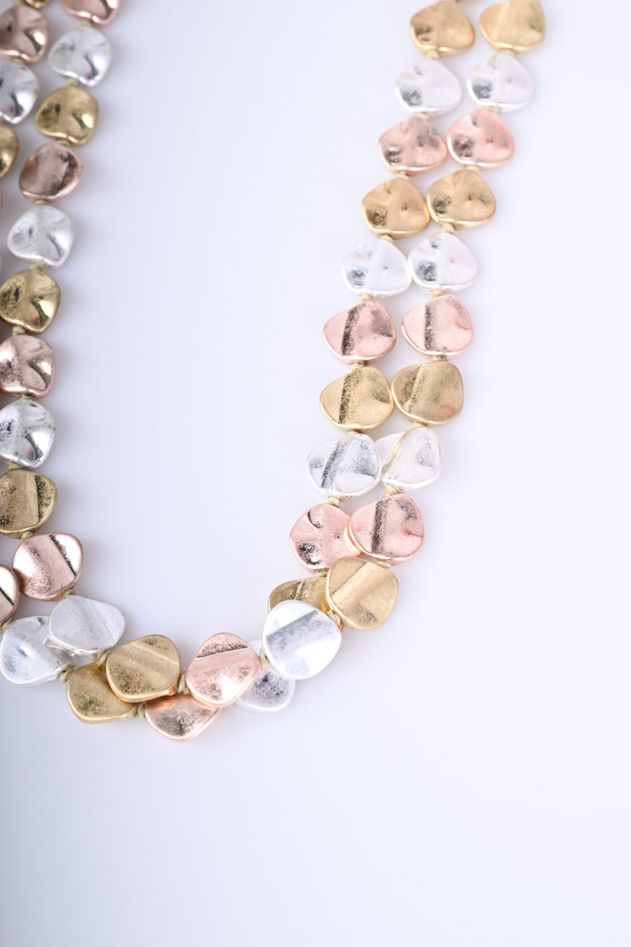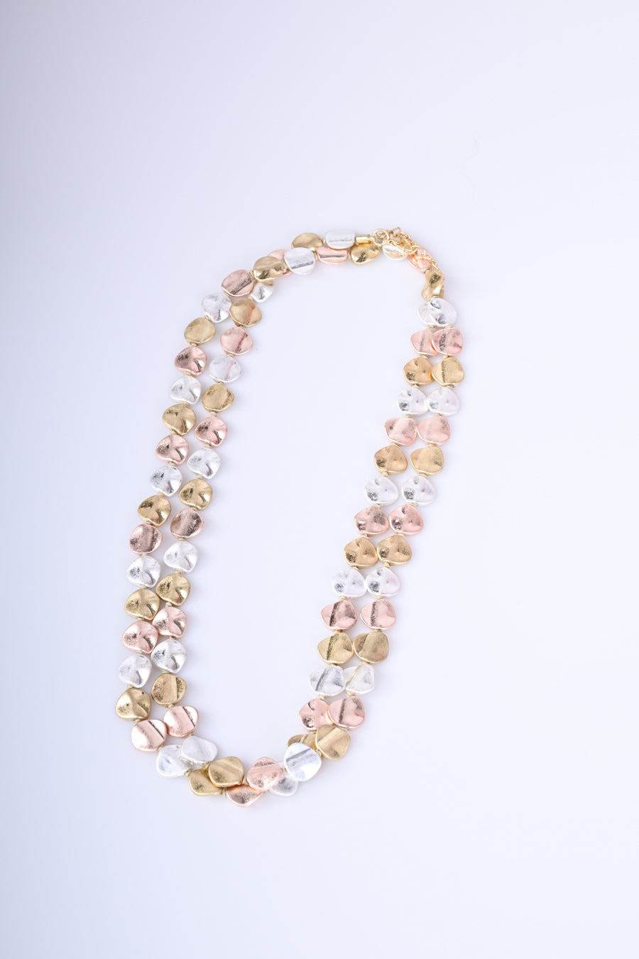 Collana a doppio filo con piastrine in metallo nei toni delloro, argento e rosa antico e chiusura regolabile con gancetto.