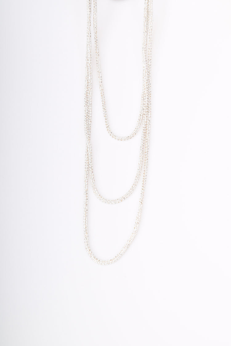 Collana lunga a tre fili con perline bianche e strass argentati.