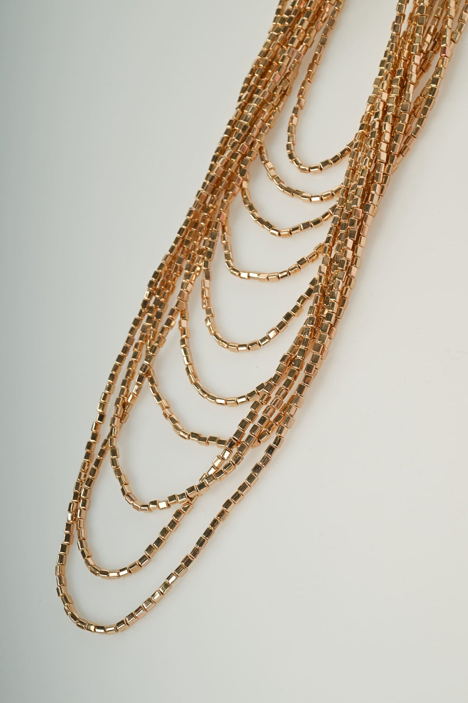 Collana multifili con perline dorate rettangolari e chiusura regolabile tramite gancetto.