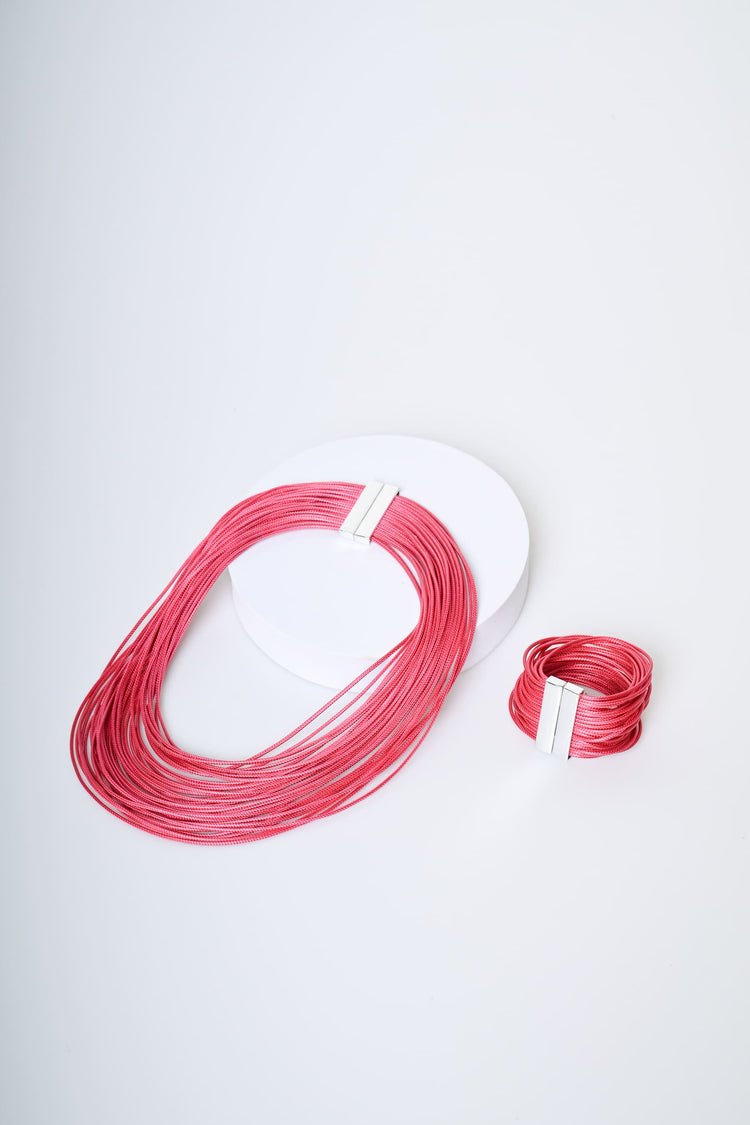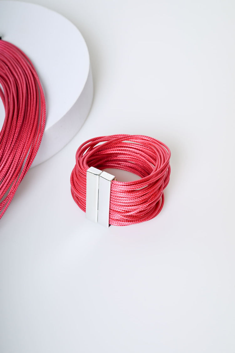 Set collana + bracciale contraddistinti da fili multipli fucsia e chiusura rigida a scatto in metallo argentato.