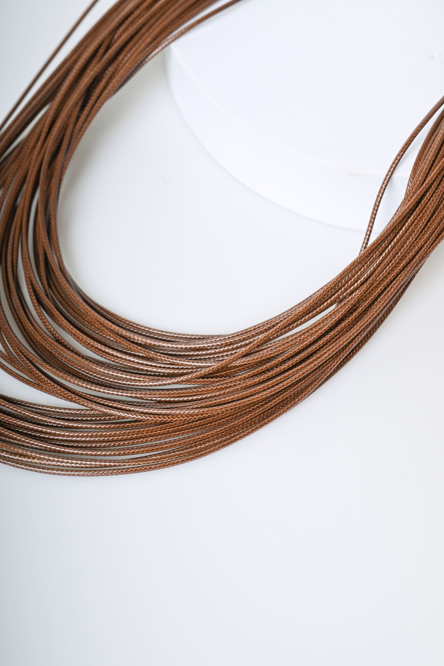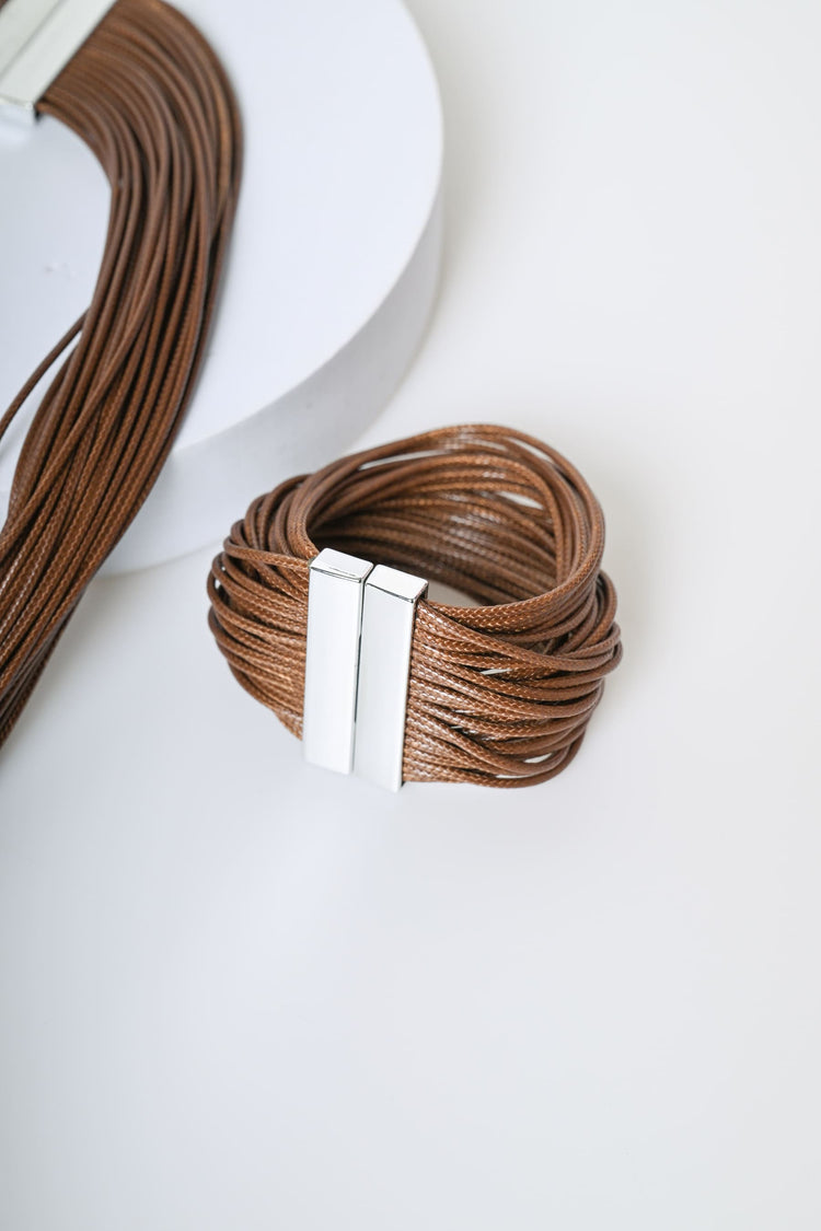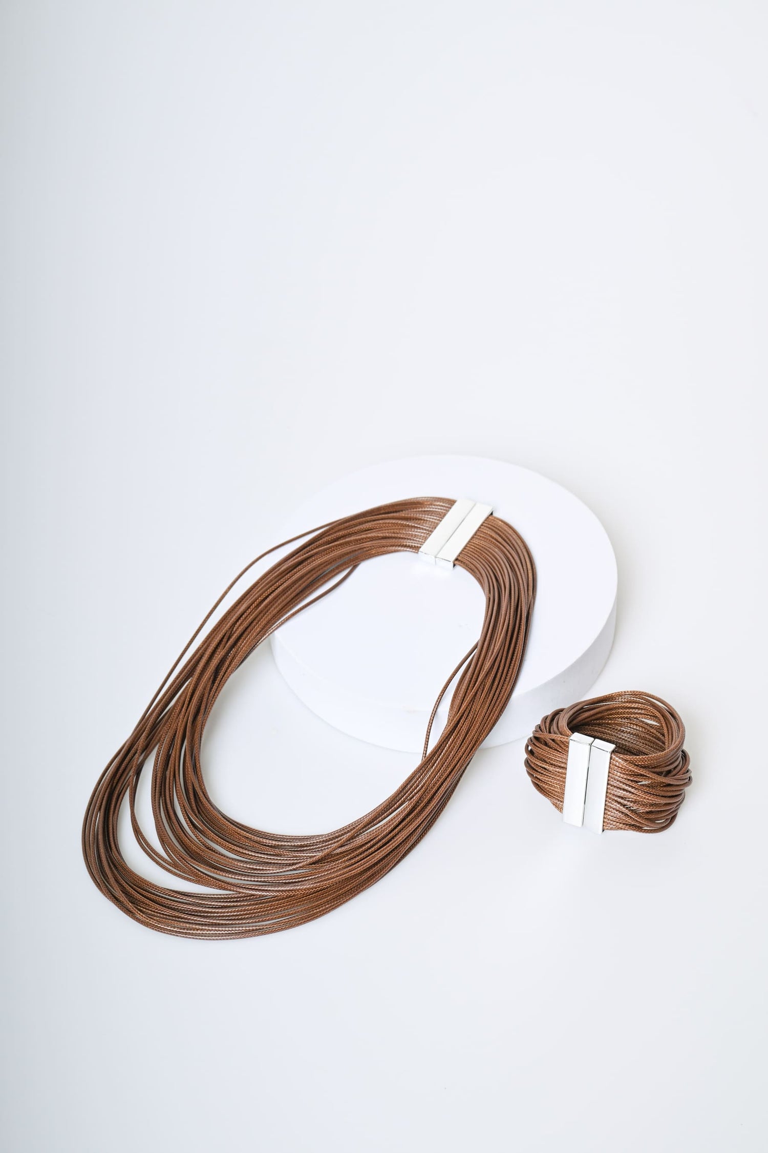 Set collana + bracciale contraddistinti da fili multipli marroni e chiusura rigida a scatto in metallo argentato.
