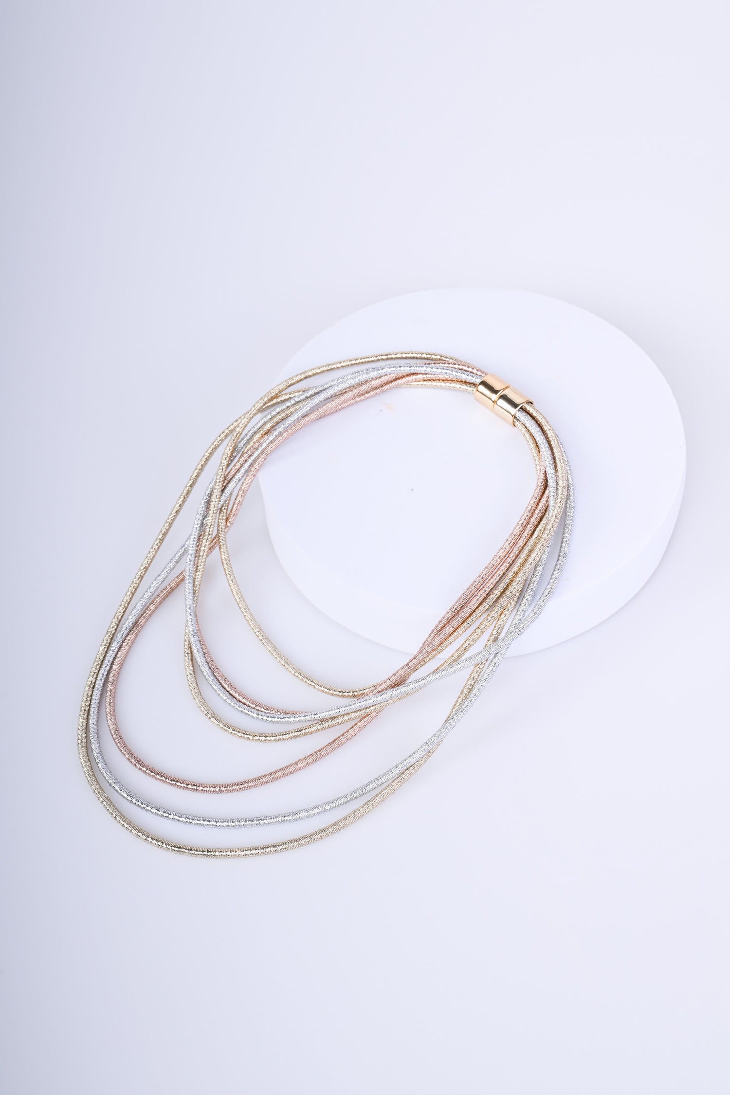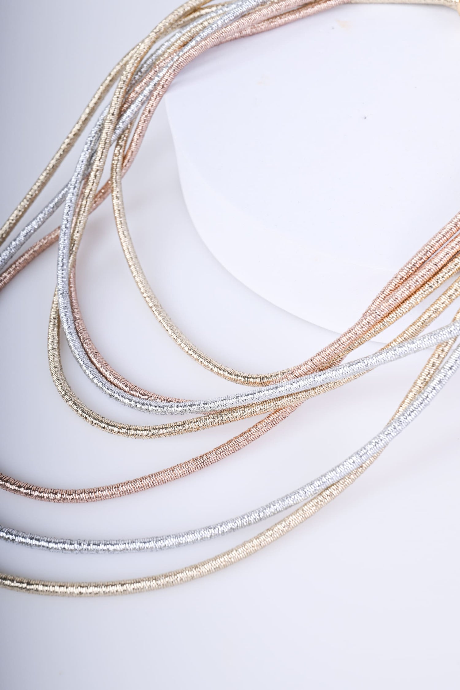Collana con fili multipli in tessuto metallizzato nei toni delloro, argento e oro rosa con gancetto di chiusura da avvitare sul retro.