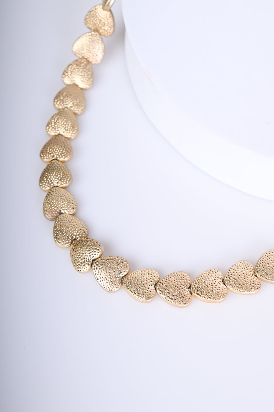 Collana in metallo dorato con piastrine a cuori e chiusura regolabile tramite gancetto.