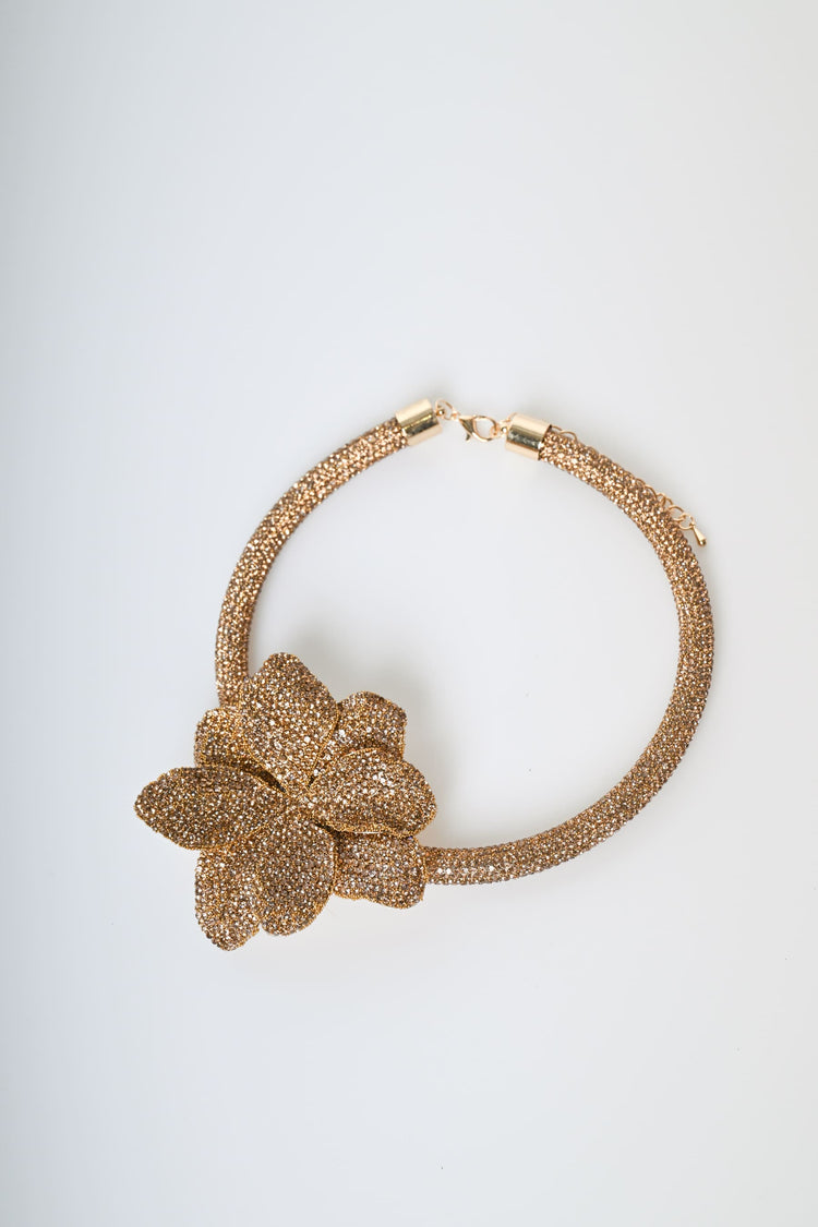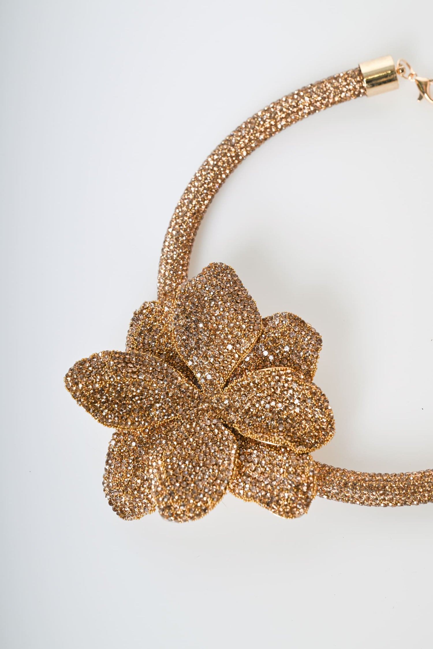Collana rigida in metallo dorato impreziosita da strass con fiore decorativo e chiusura regolabile tramite gancetto sul retro.