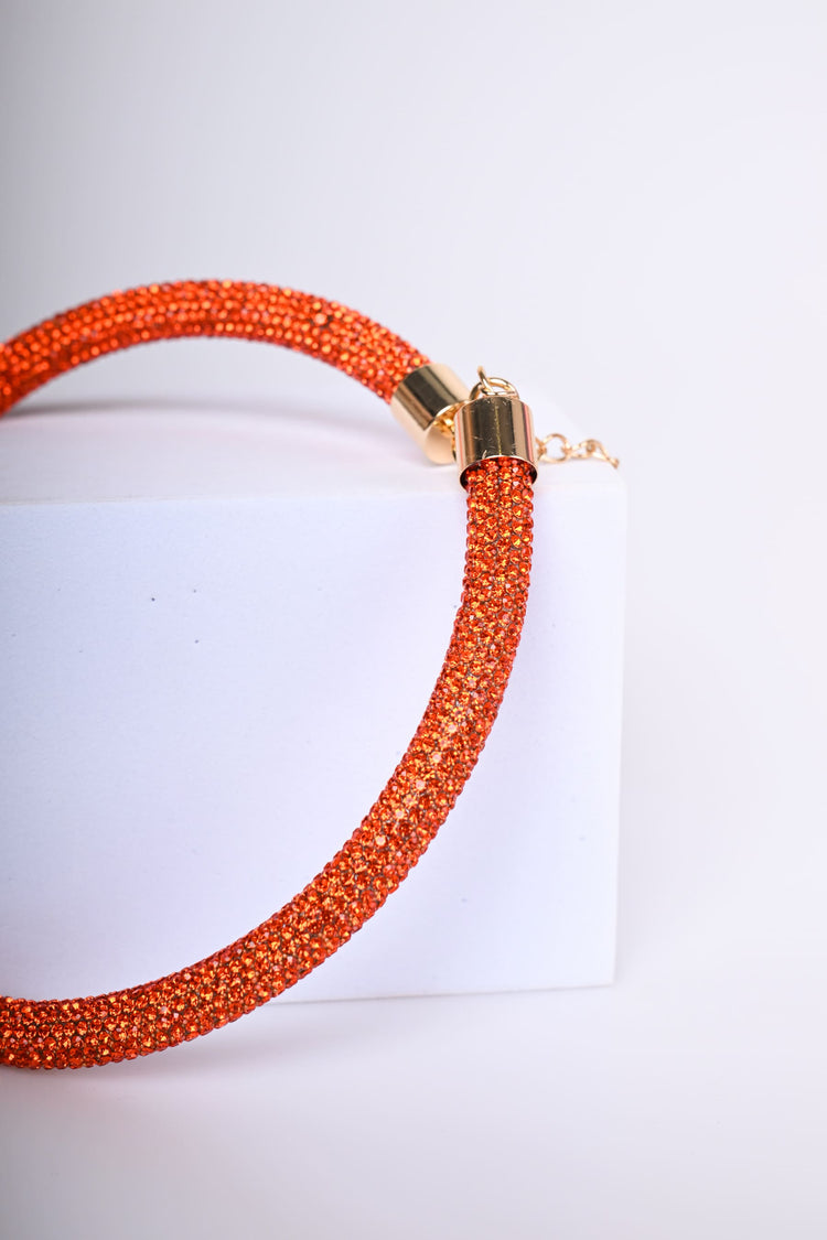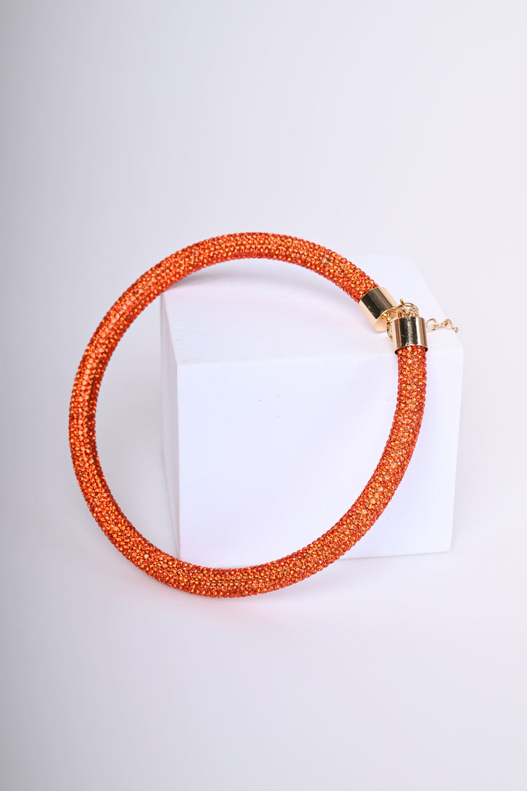Collana rigida tubolare impreziosita da strass arancioni e con chiusura regolabile tramite gancetto in metallo dorato.