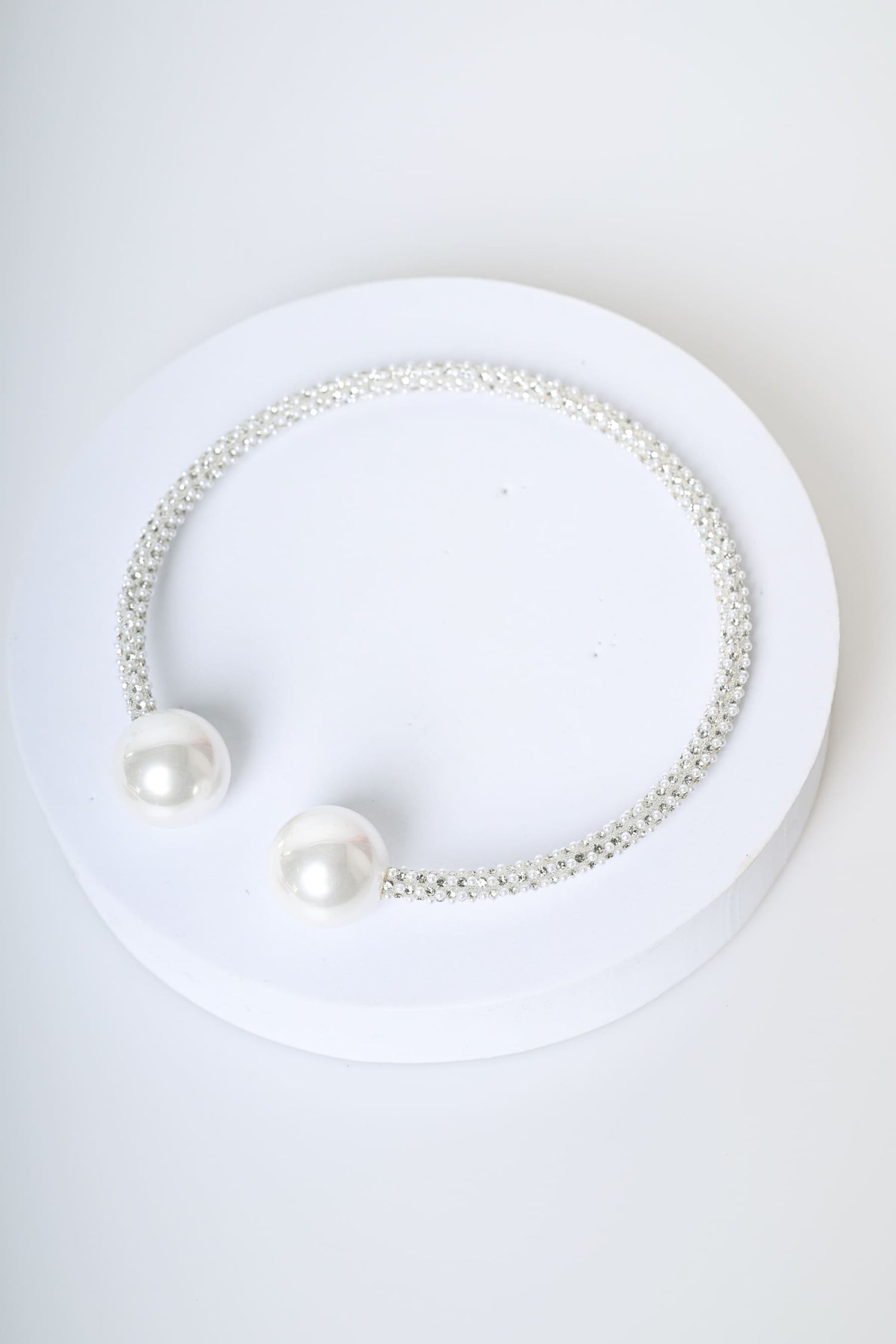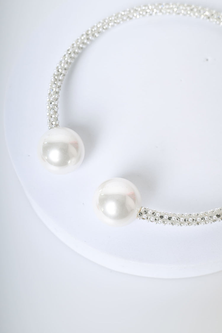 Collana rigida a semicerchio impreziosita da perline e strass nei toni del bianco e argento e con perle decorative.