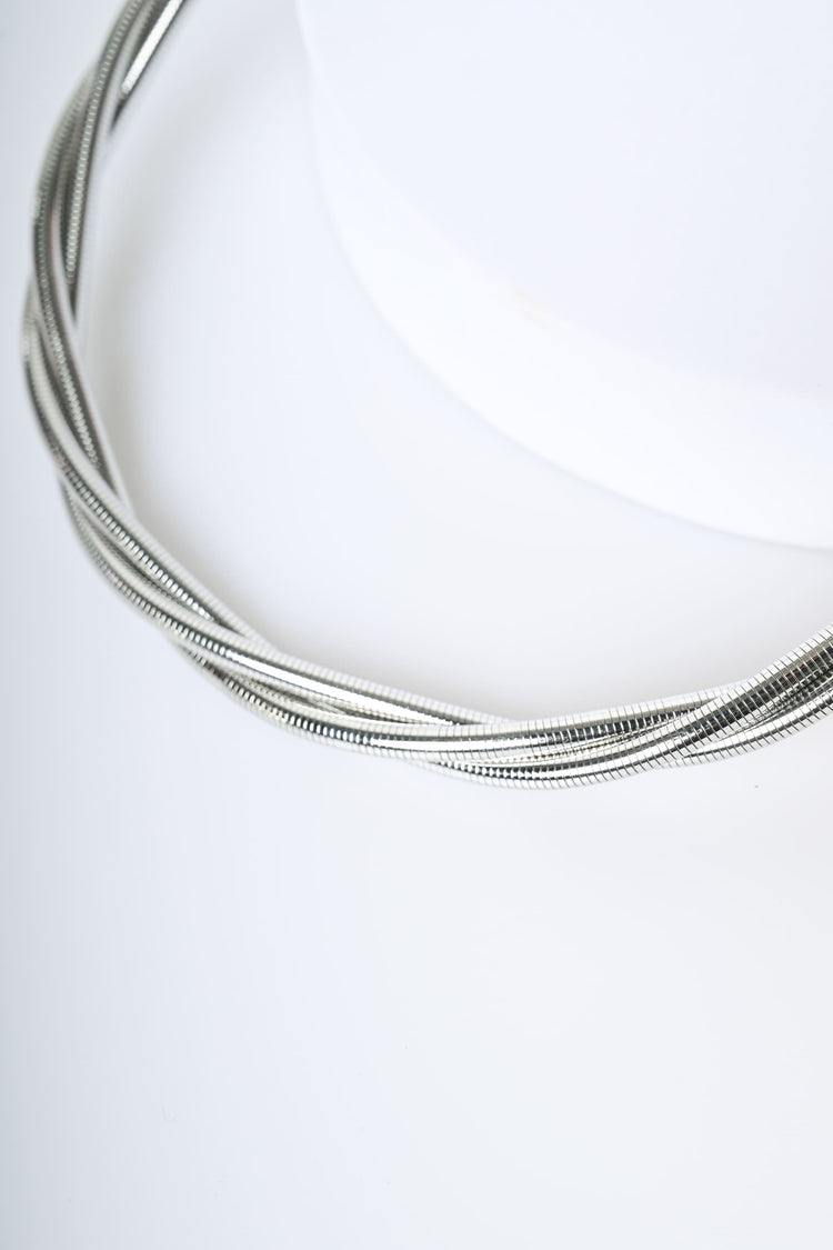 Collana a tre fili attorcigliati in metallo argentato con chiusura regolabile tramite gancetto sul retro.