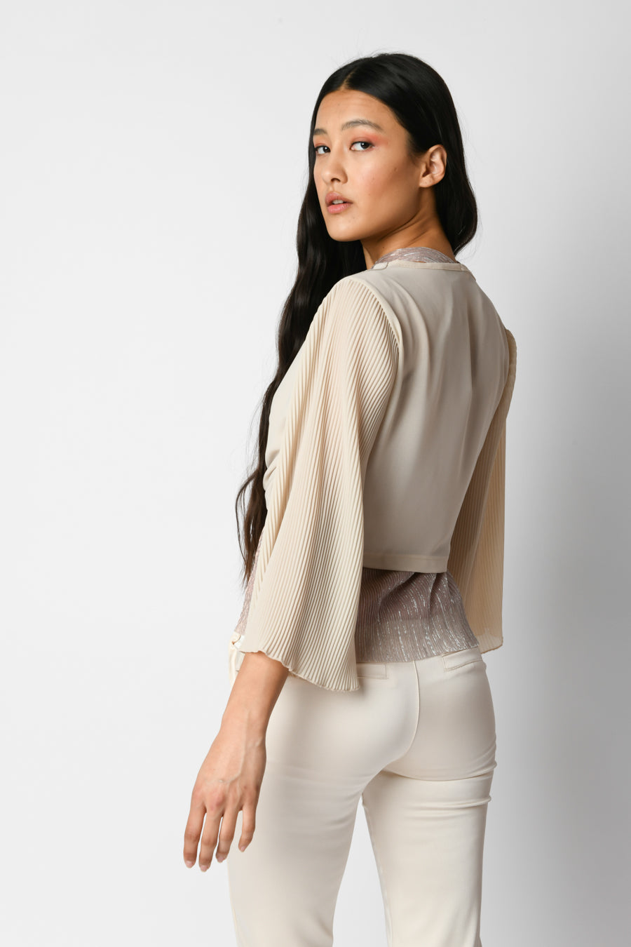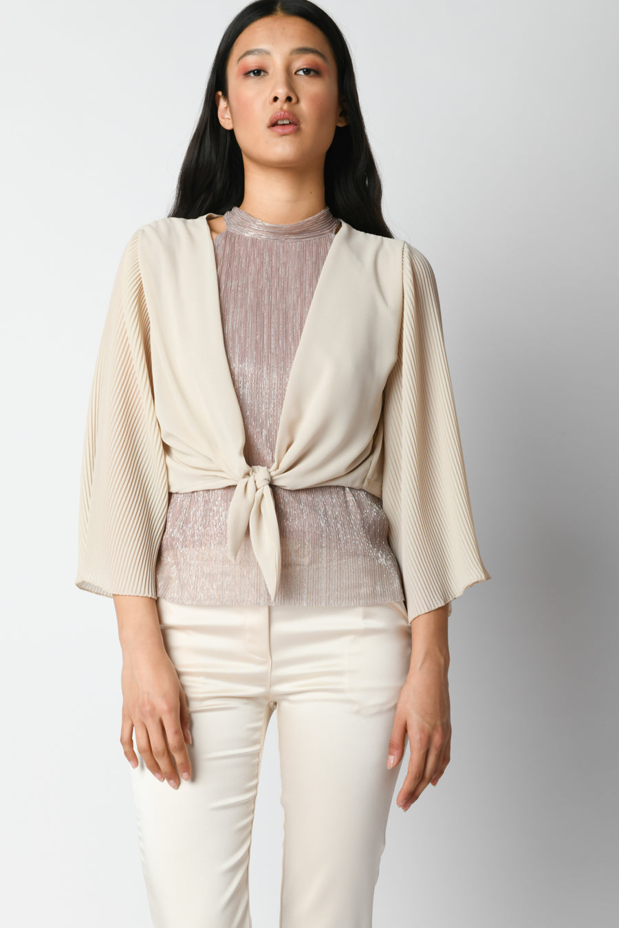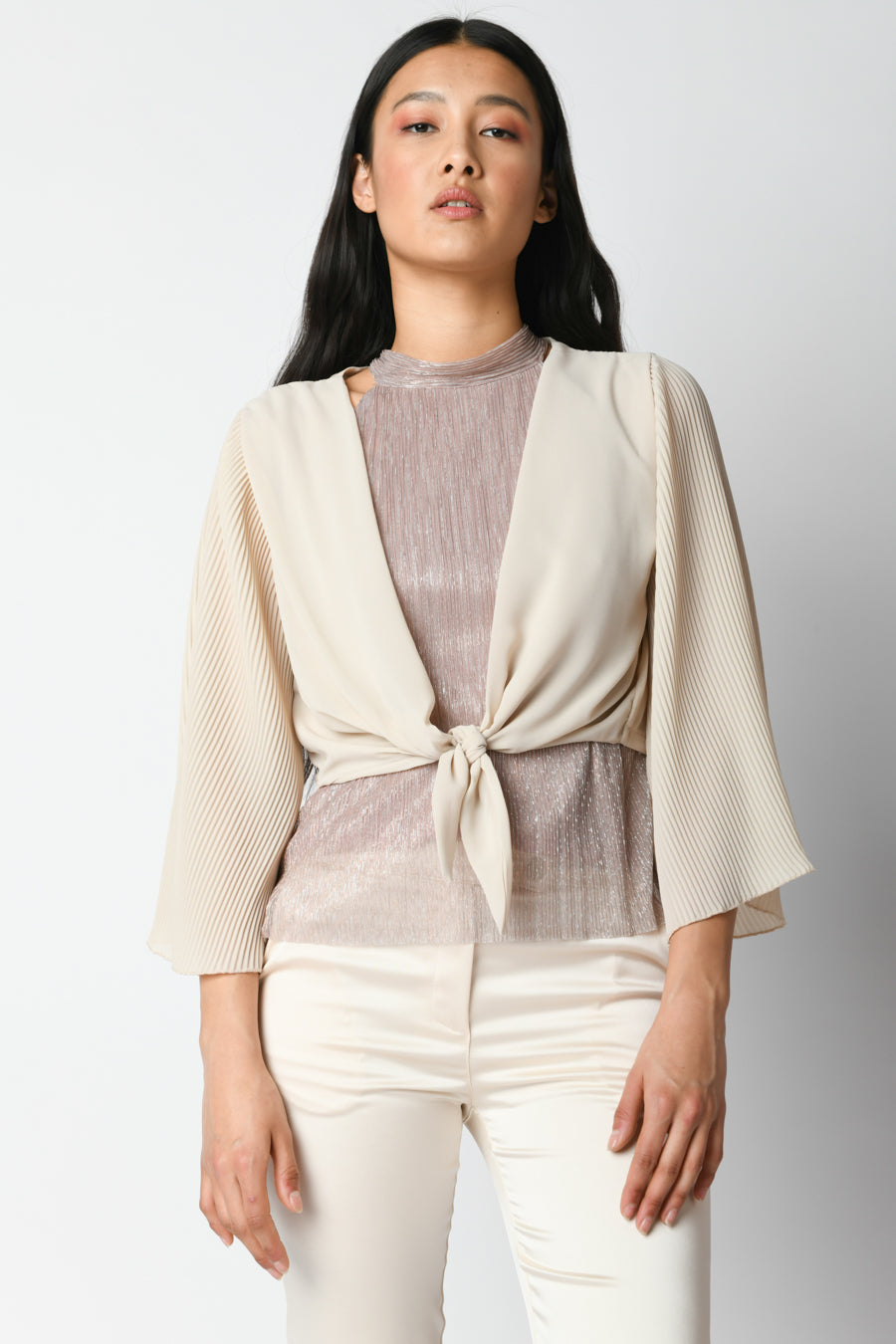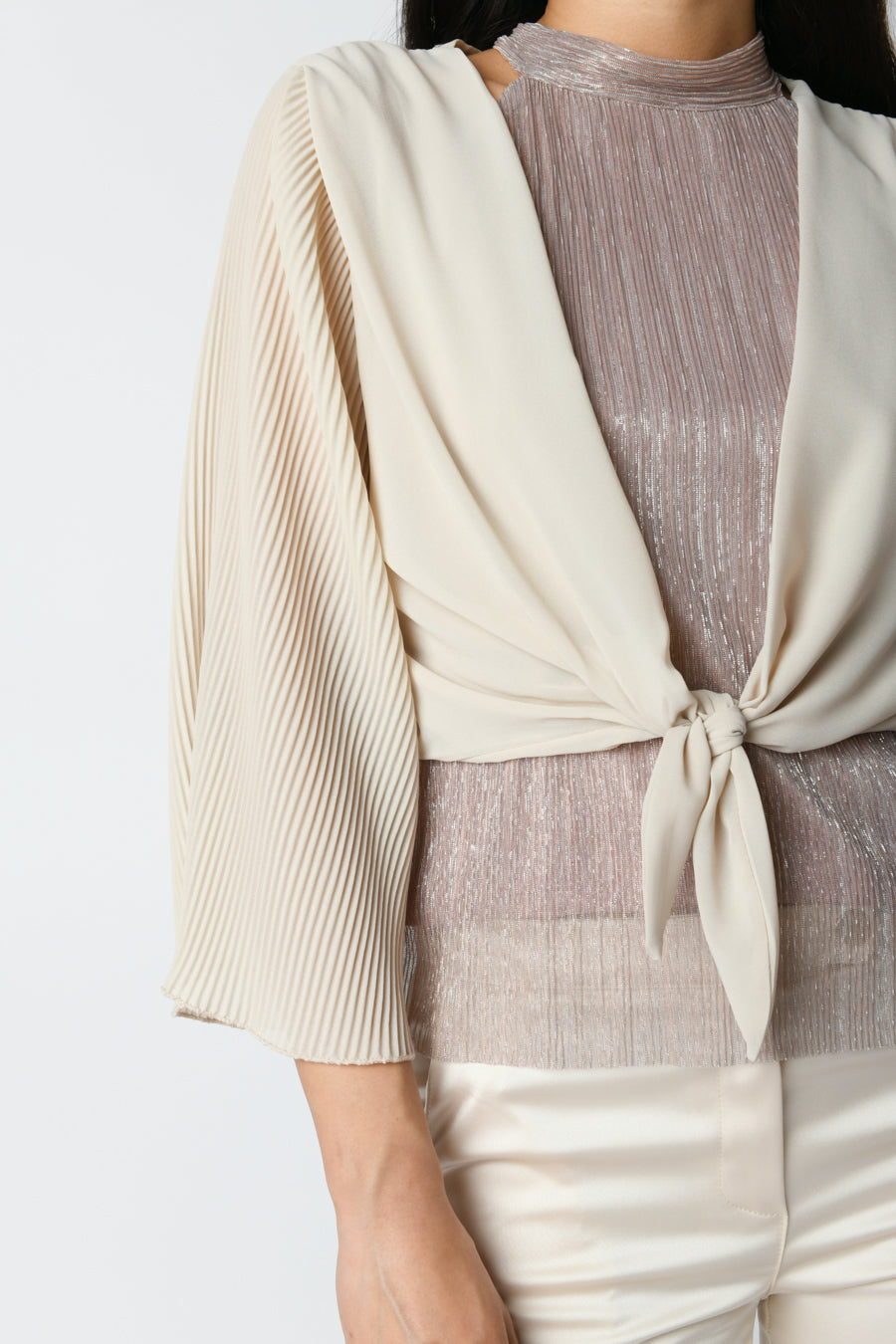 Coprispalle crop in crêpe avorio con nodo frontale e maniche tre quarti plissettate.