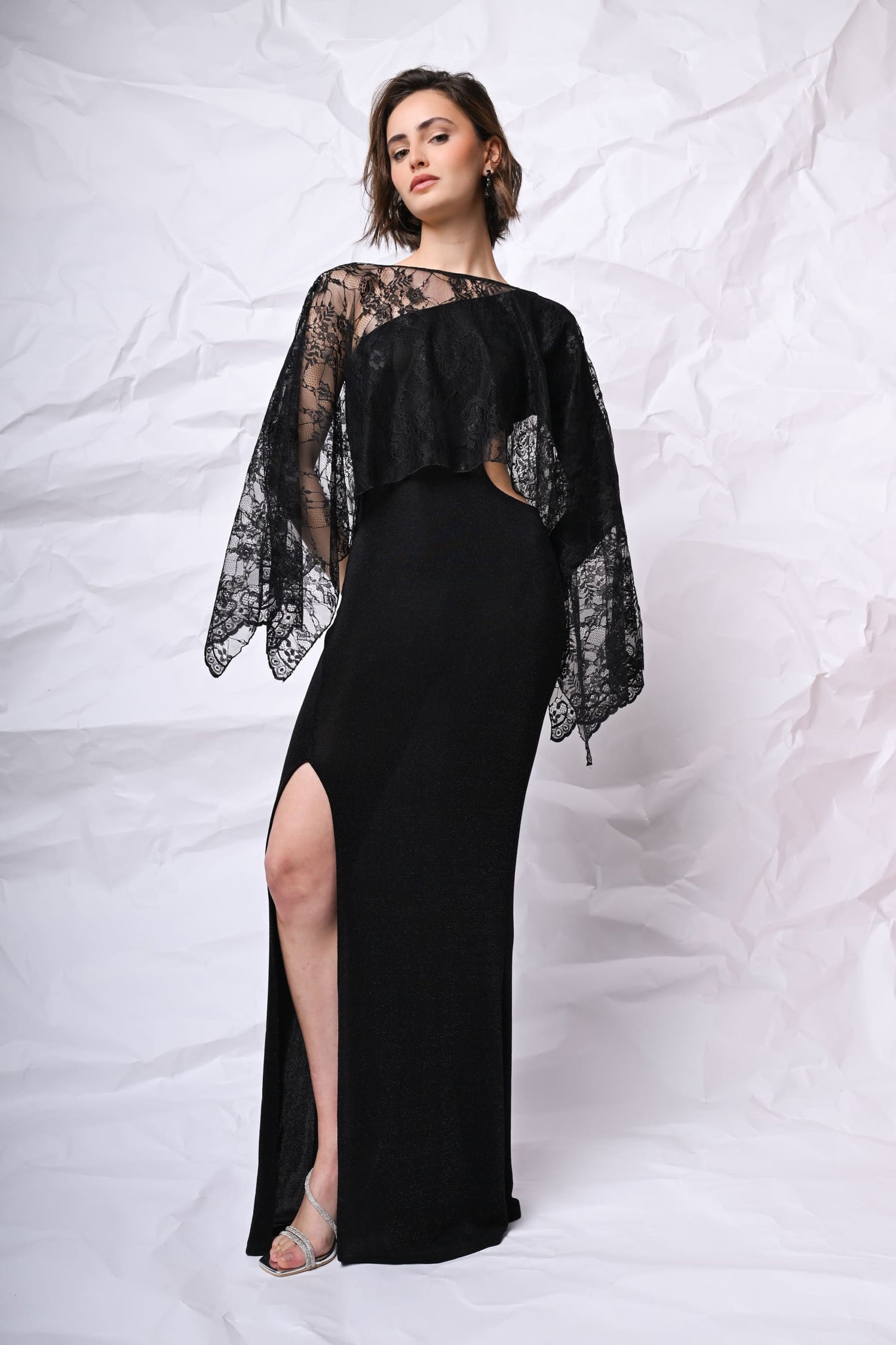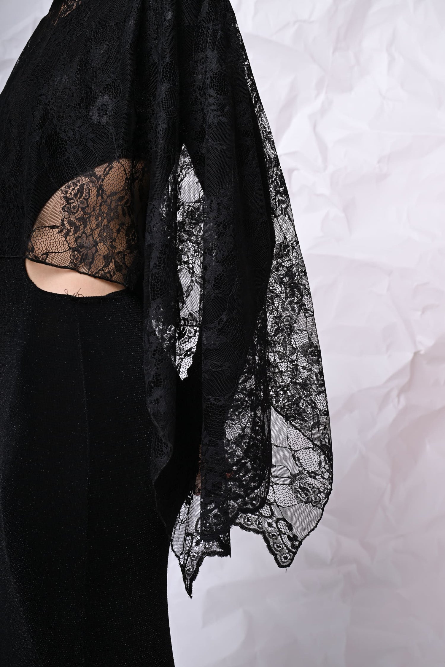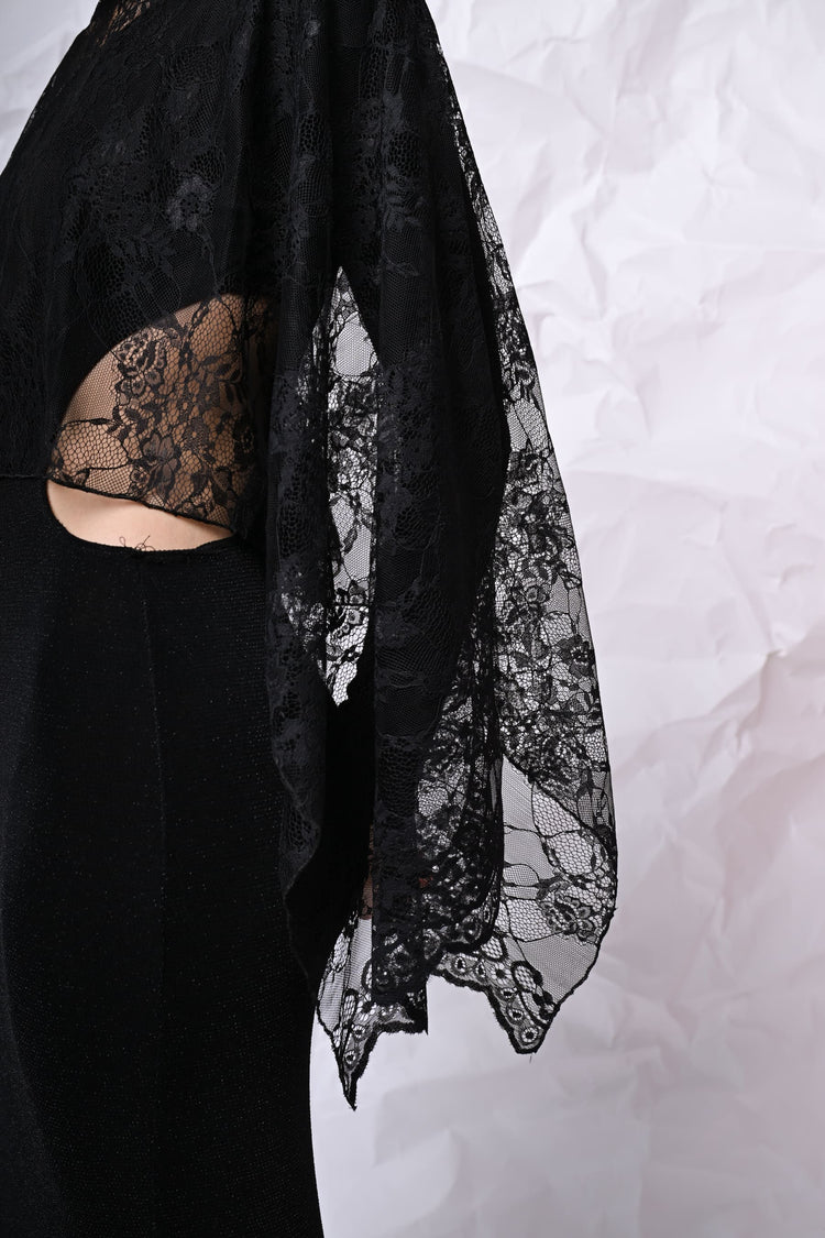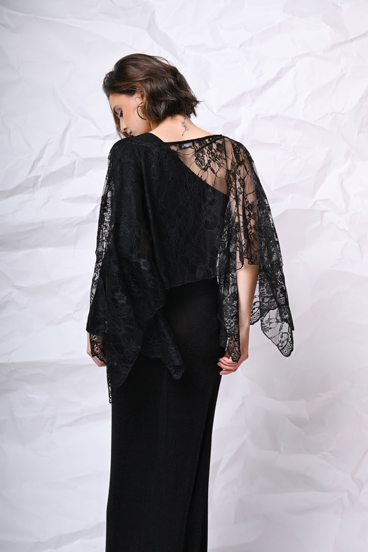 Coprispalle in pizzo trasparente nero con scollo a barchetta, taglio squadrato e maniche fluenti.