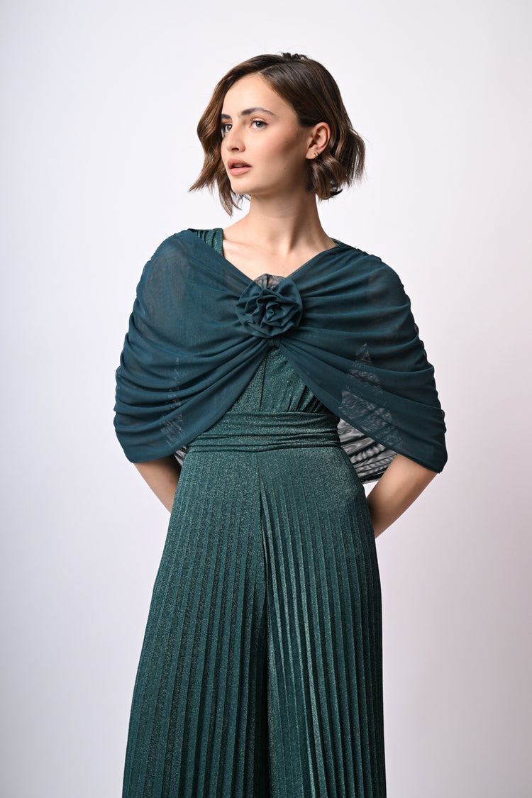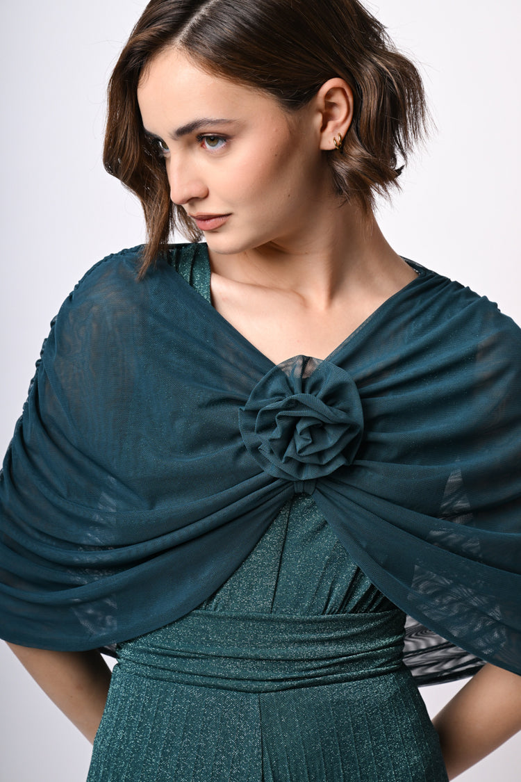 Coprispalle in tulle verde bottiglia con rosa 3D in tessuto al centro e silhouette drappeggiata.