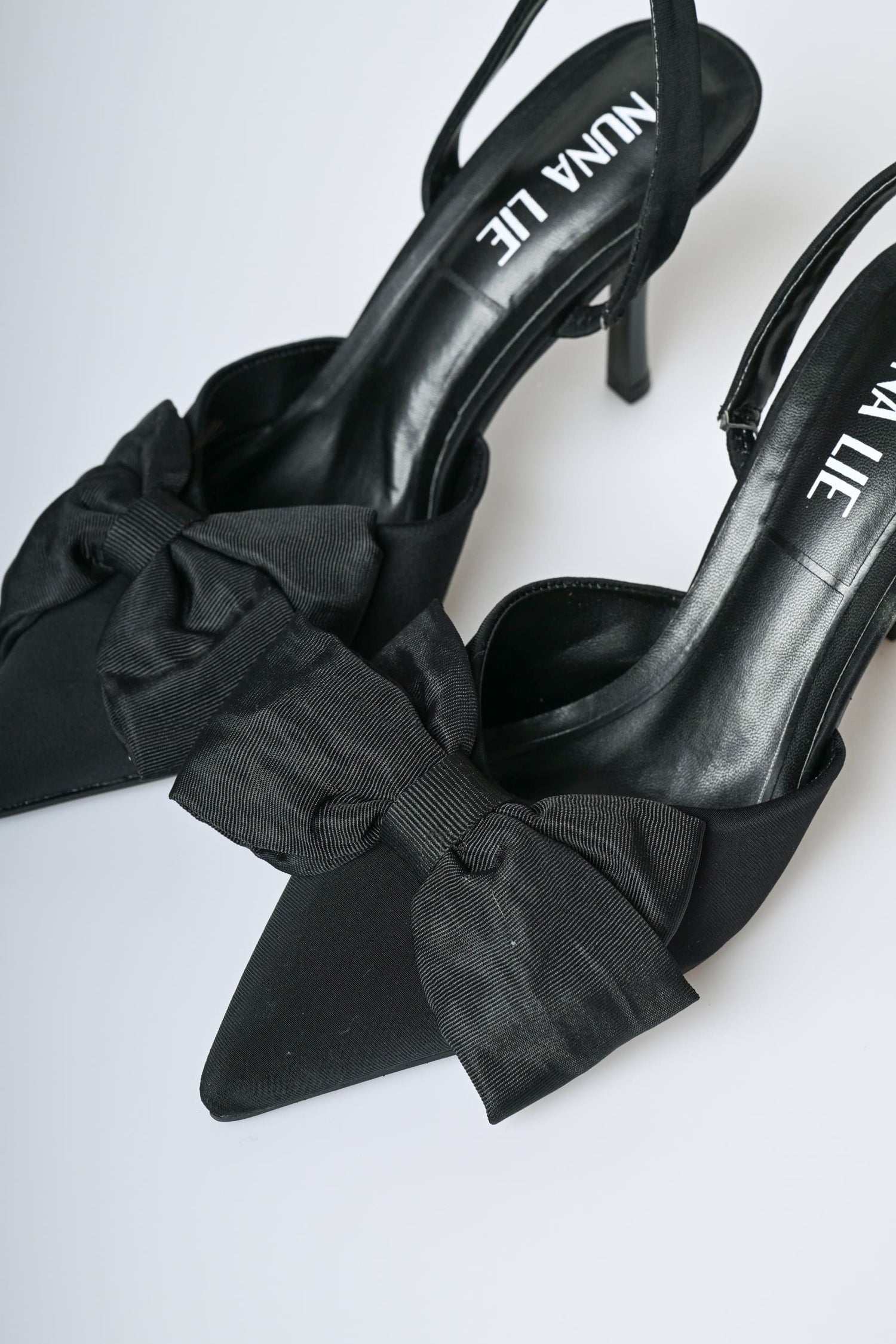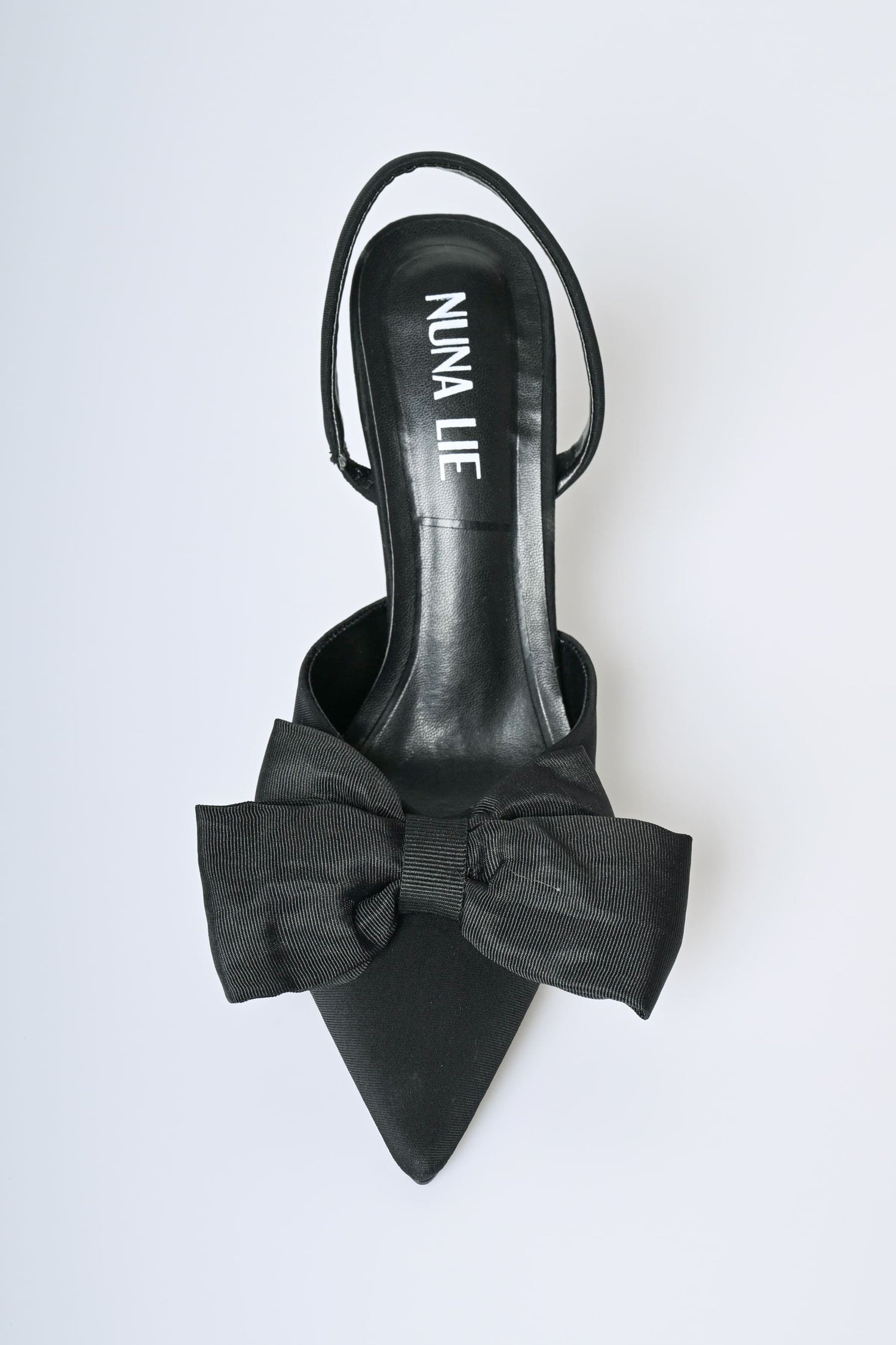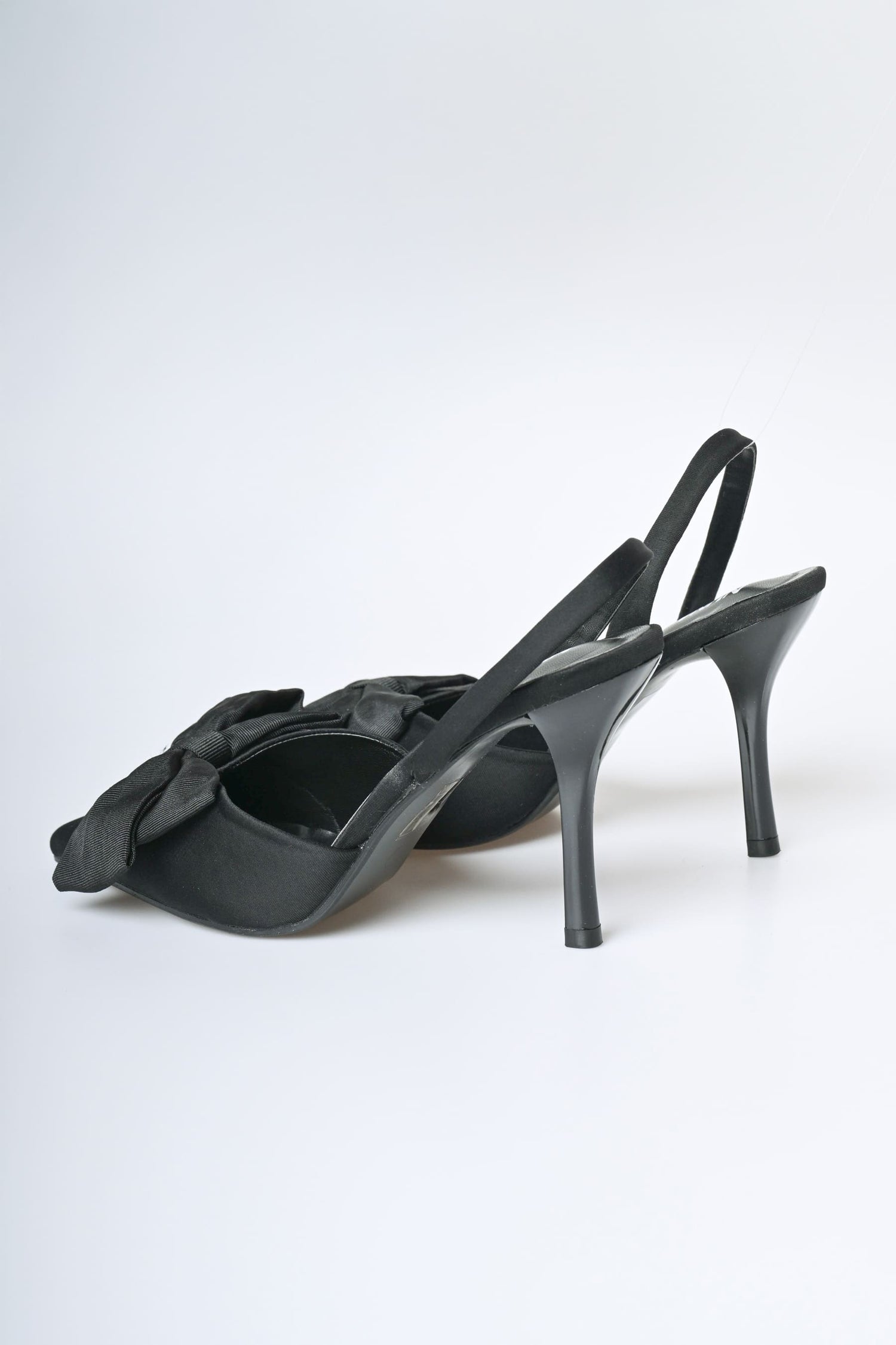 Décolleté slingback in tessuto nero e similpelle con cinturini posteriori elasticizzati, punta affusolata, fiocco in grosgrain e tacco a spillo.