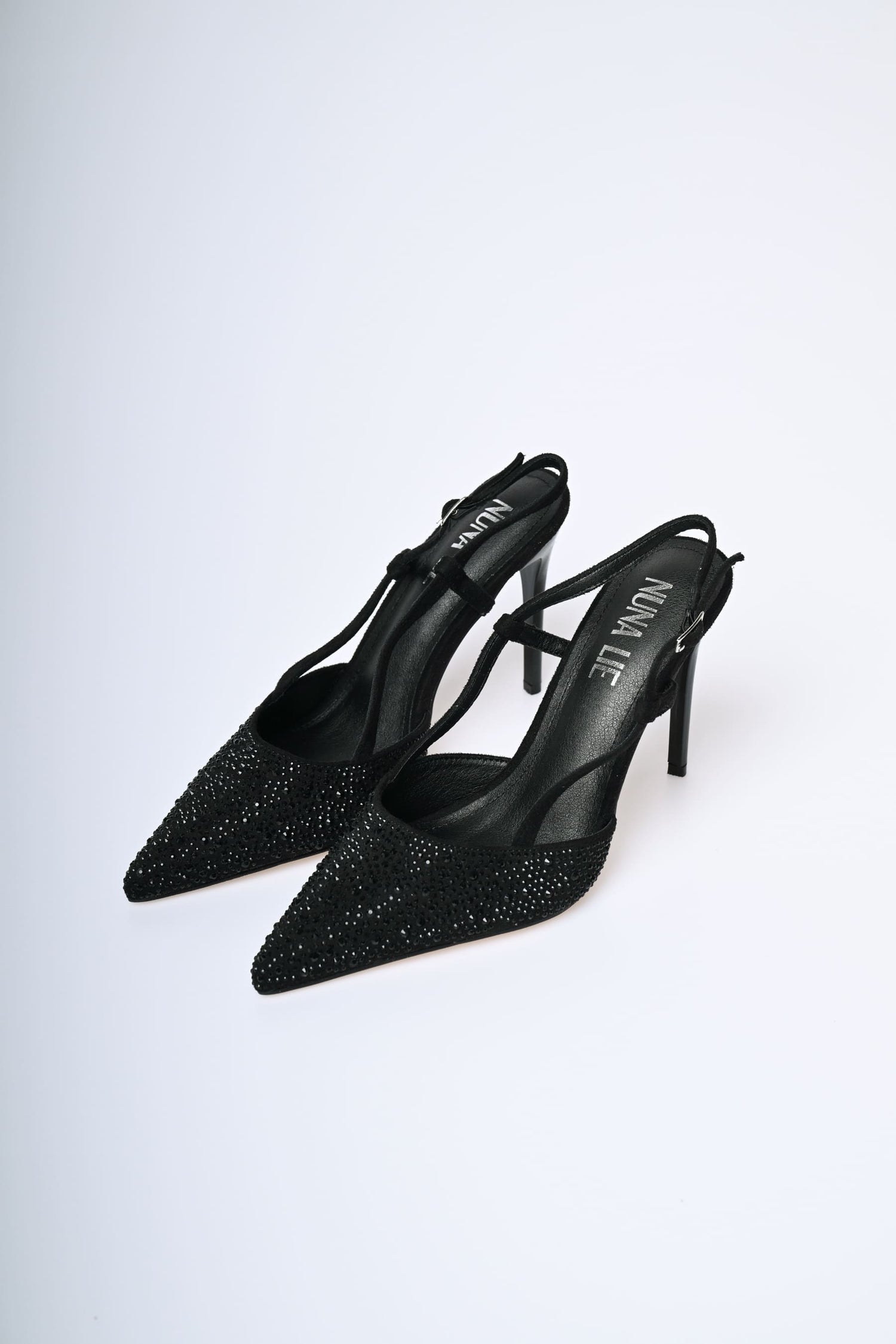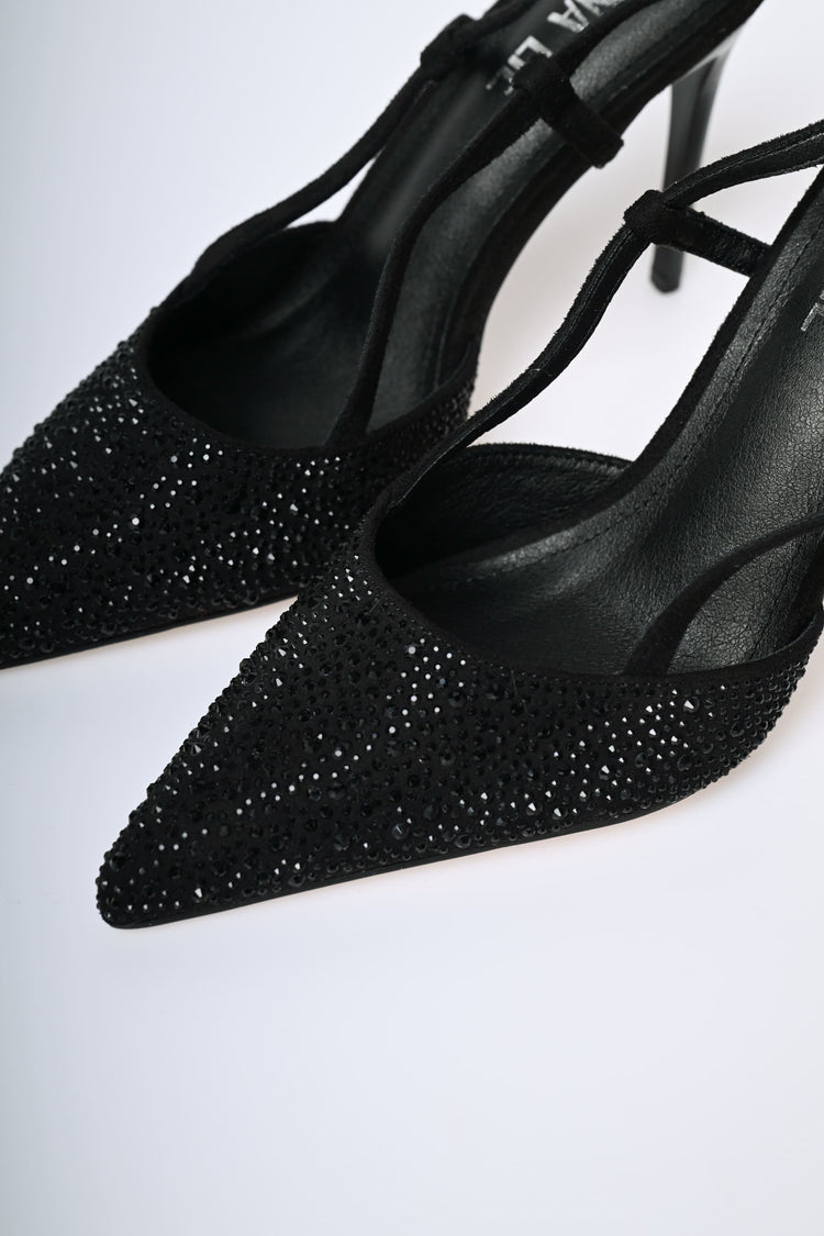 Décolleté slingback in similpelle scamosciata nera con punta impreziosita da strass tono su tono, cinturino sottile posteriore regolabile con fibbia e tacco a spillo.
