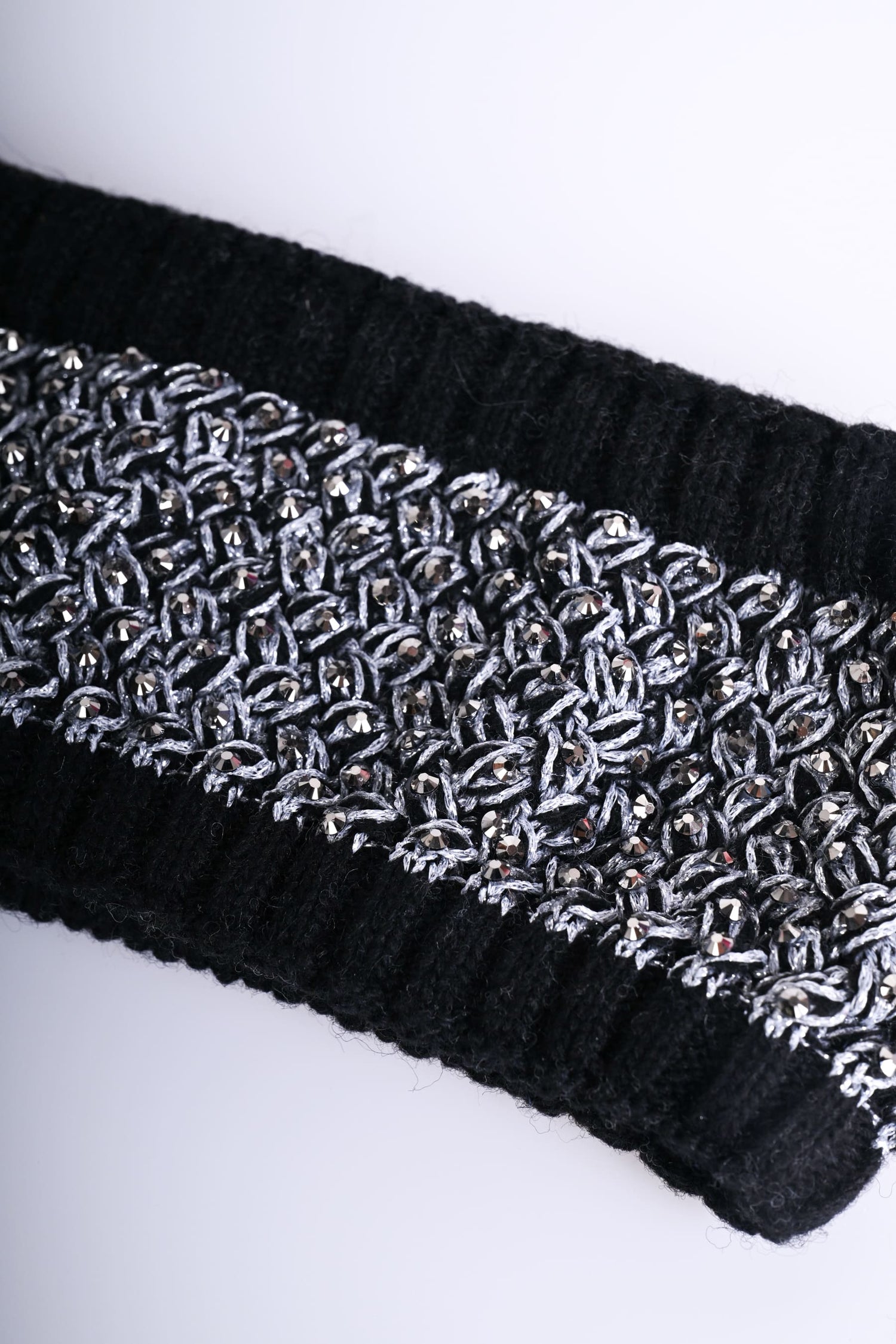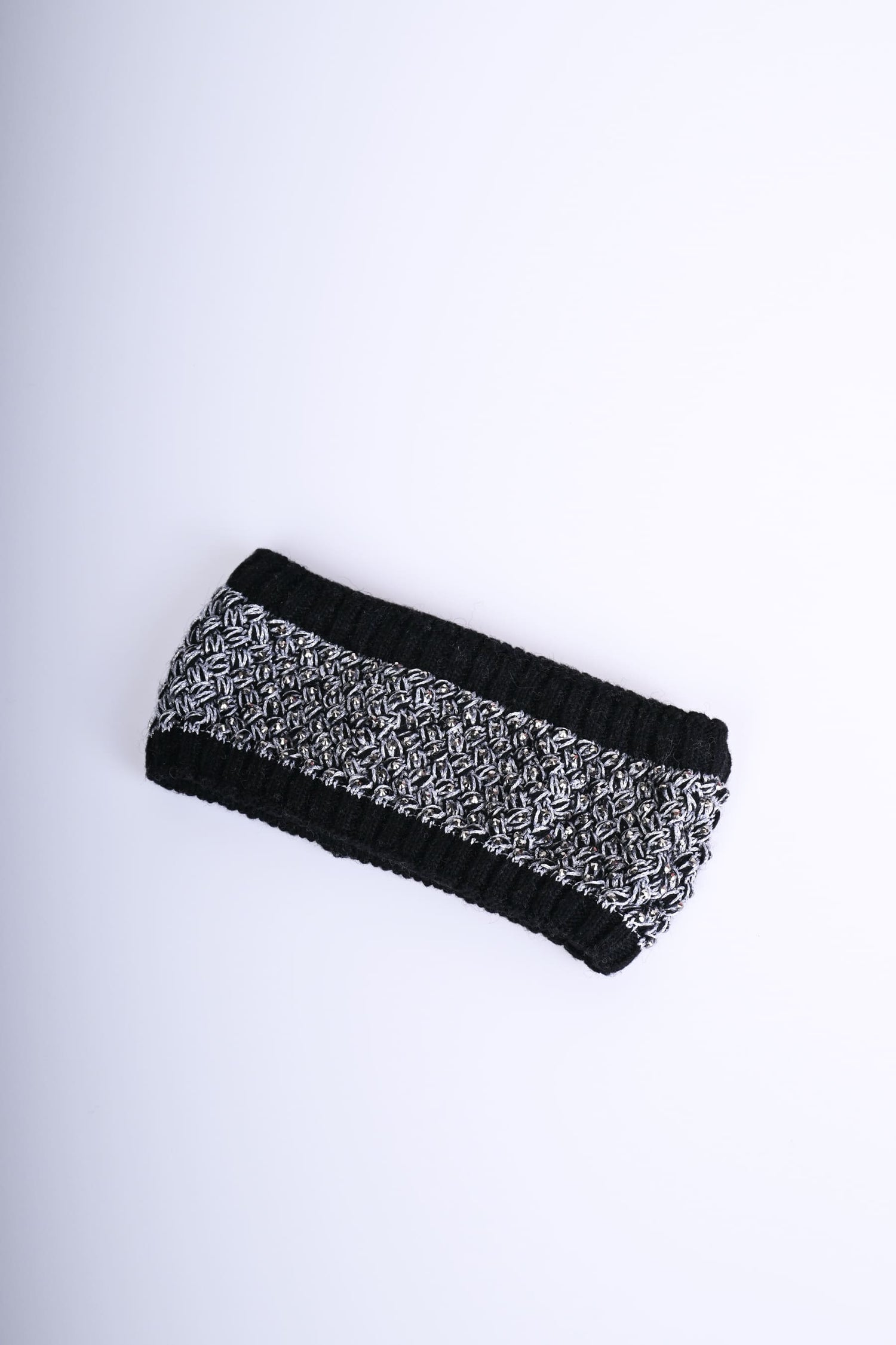 Fascia per capelli in maglia misto lana a nido dape bianca e nera, impreziosita da strass e con profili a costine in maglia nera.