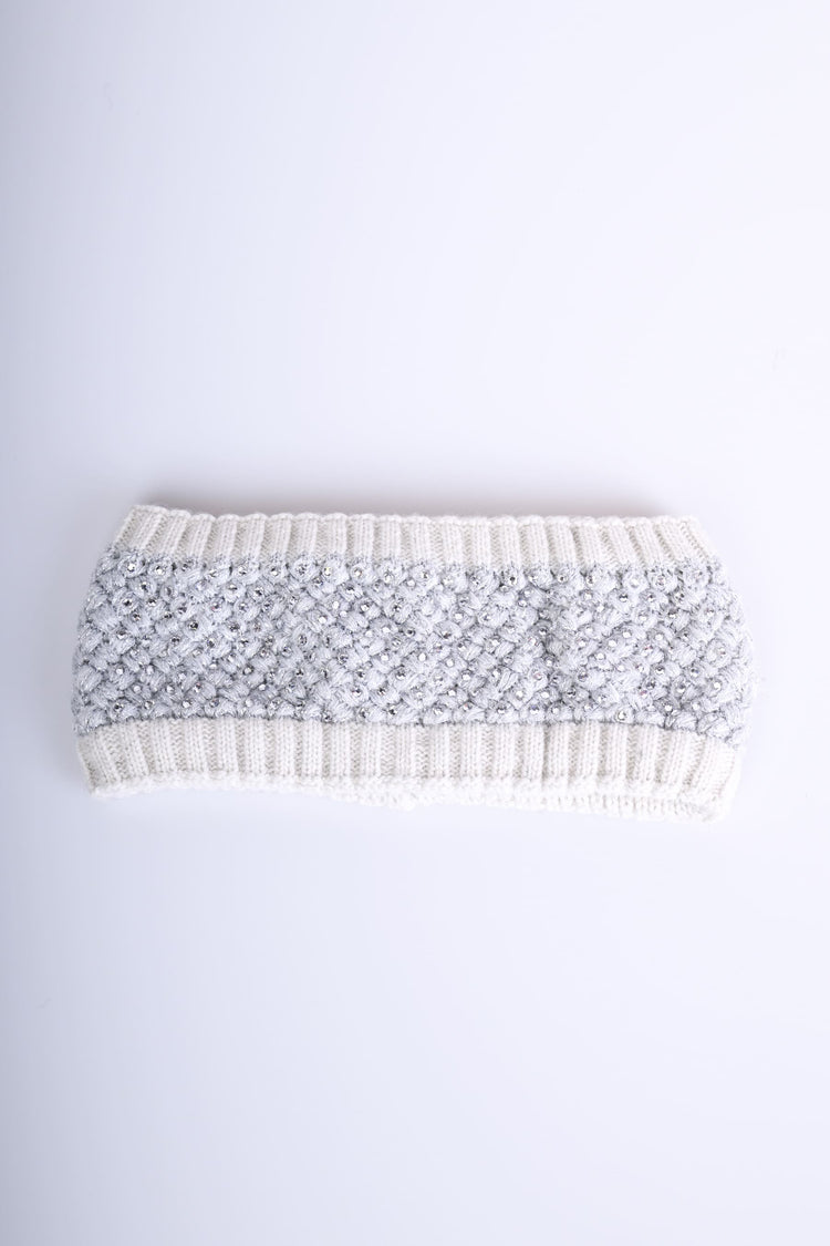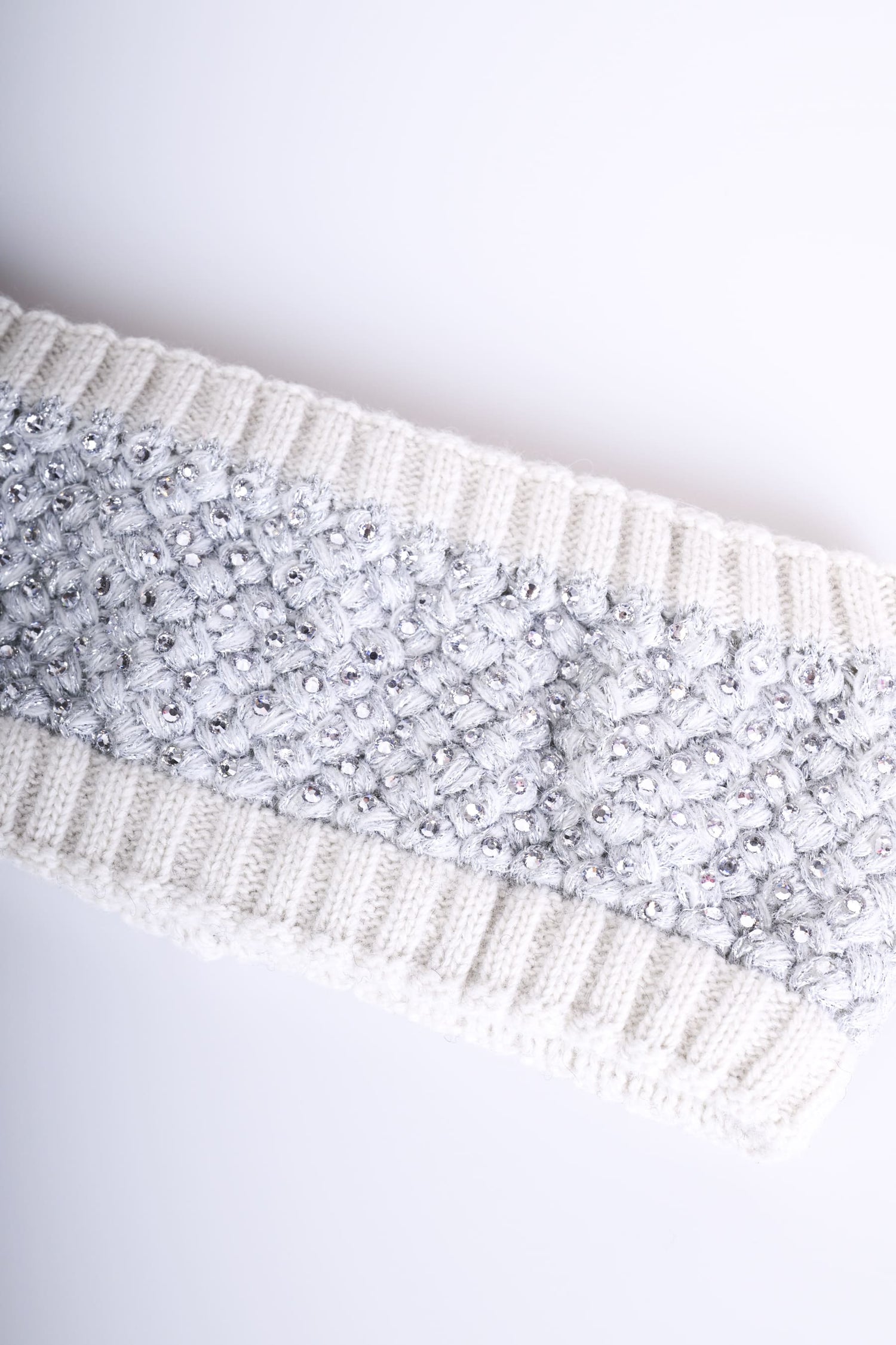 Fascia per capelli in maglia misto lana a nido dape grigio chiaro, impreziosita da strass e con profili a costine in maglia bianca.