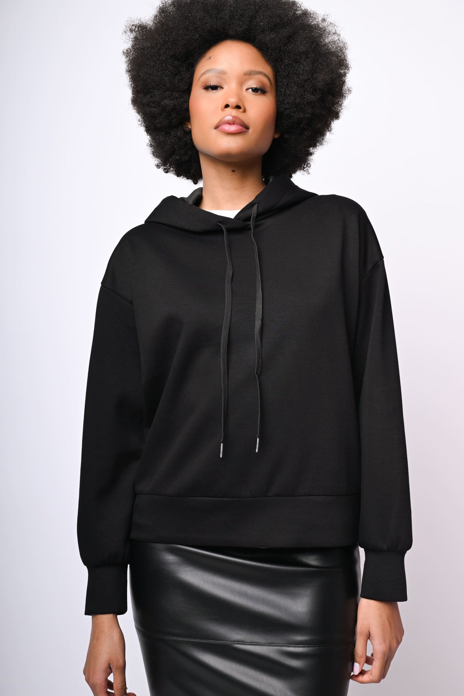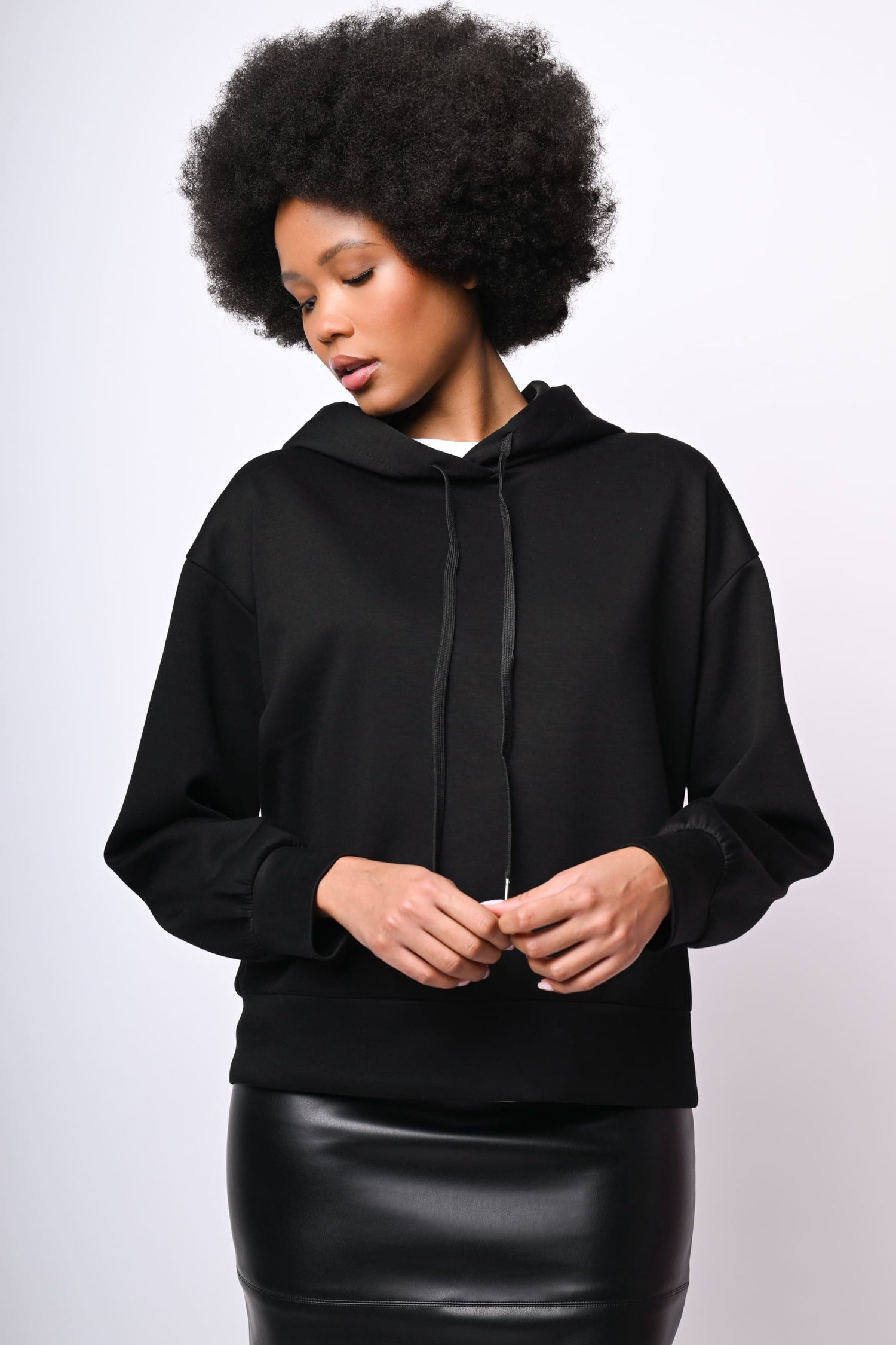 Felpa misto rayon nero con cappuccio con coulisse regolabile, spalle scese e silhouette morbida.