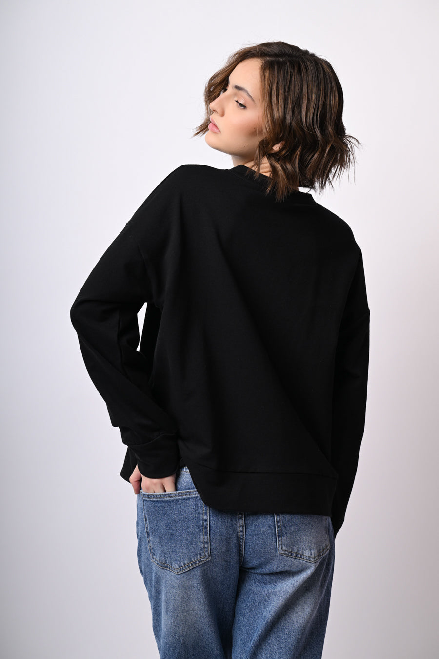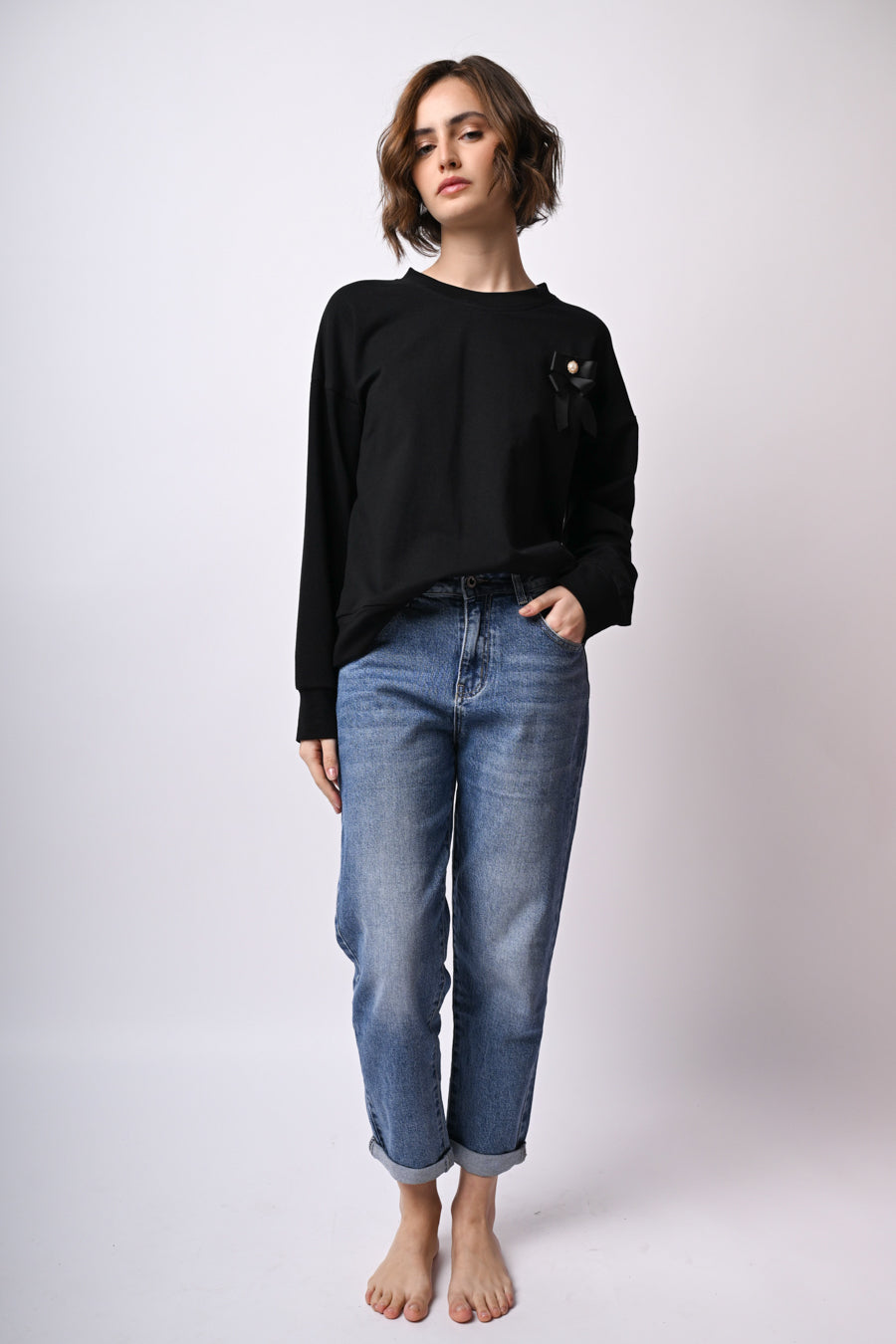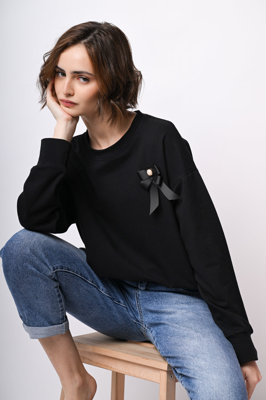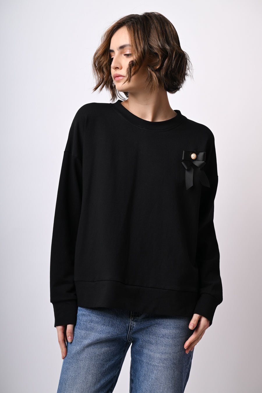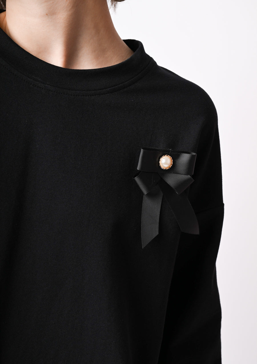 Felpa in cotone stretch nero con scollo tondo, spalle scese e spilla a fiocco in grosgrain nero con perla sul petto.