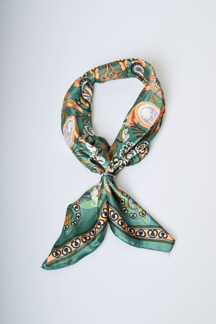 Foulard in raso a stampa floreale multicolor su fondo verde con anello in metallo argentato.