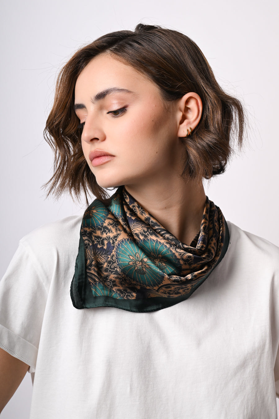 Foulard quadrato in raso a stampa etnica nei toni del verde e oro.