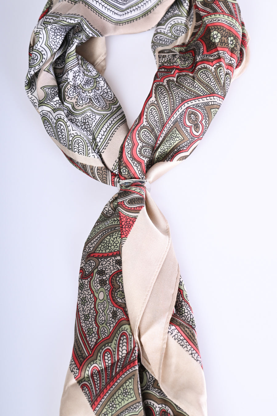 Foulard in raso a stampa etnica multicolor su fondo beige con anello in metallo argentato.