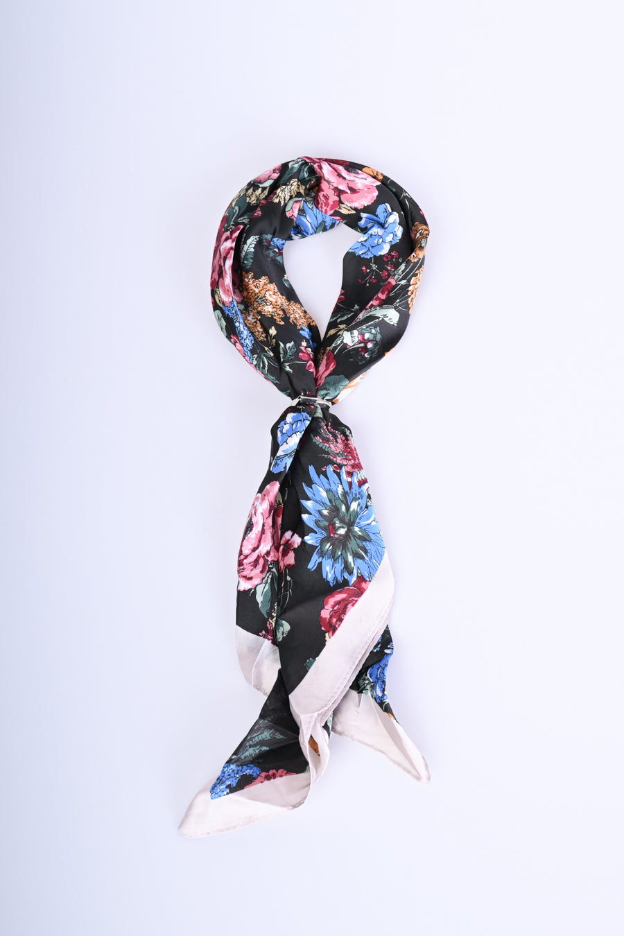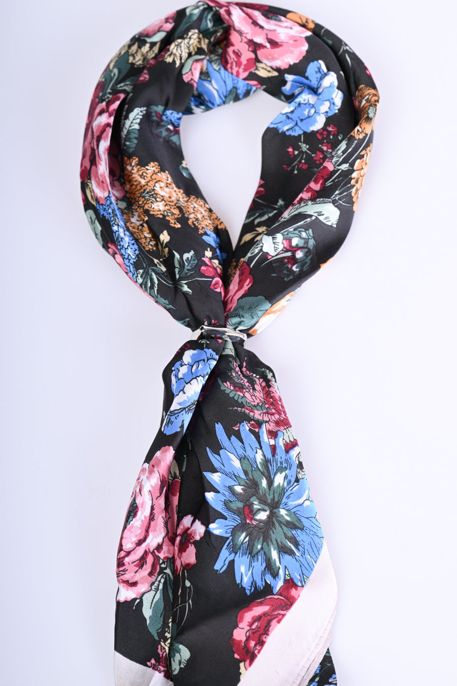 Foulard in raso a stampa floreale multicolor su fondo nero con bordo bianco e anello in metallo argentato.