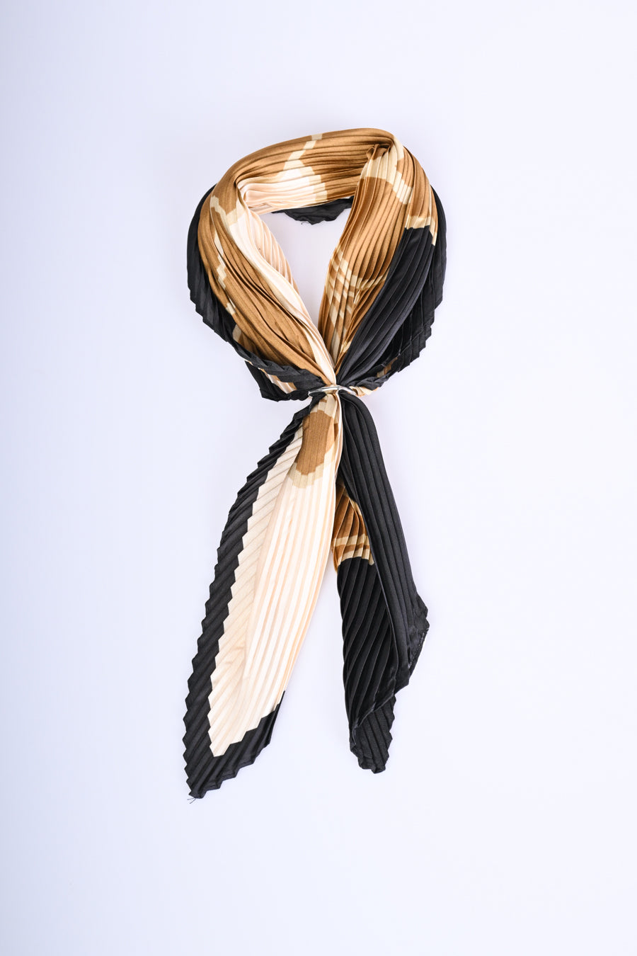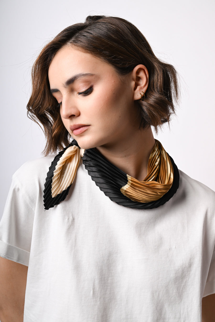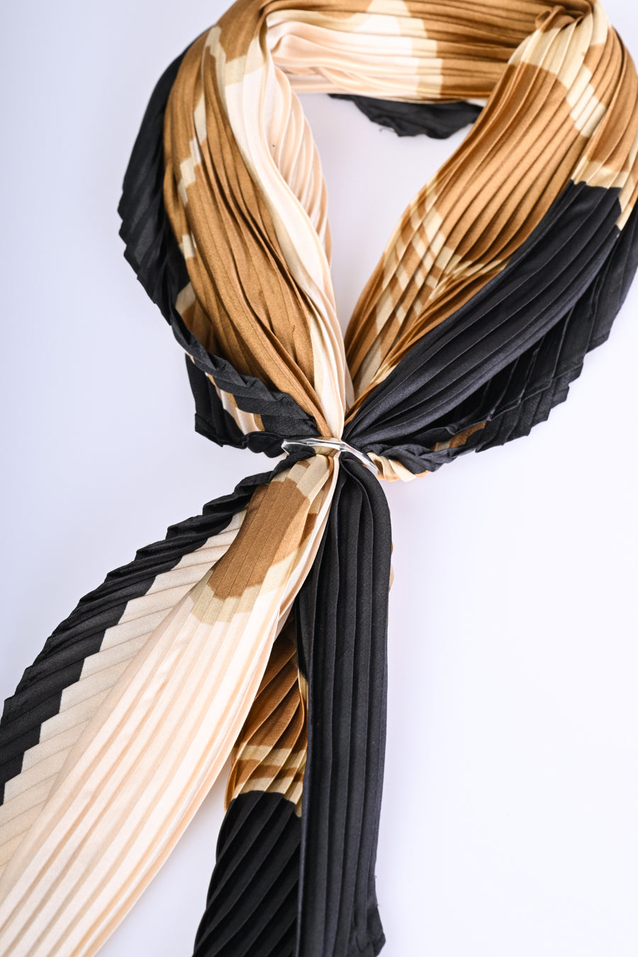 Foulard quadrato in raso plissé a stampa astratta nei toni del nero e beige con anello in metallo argentato.
