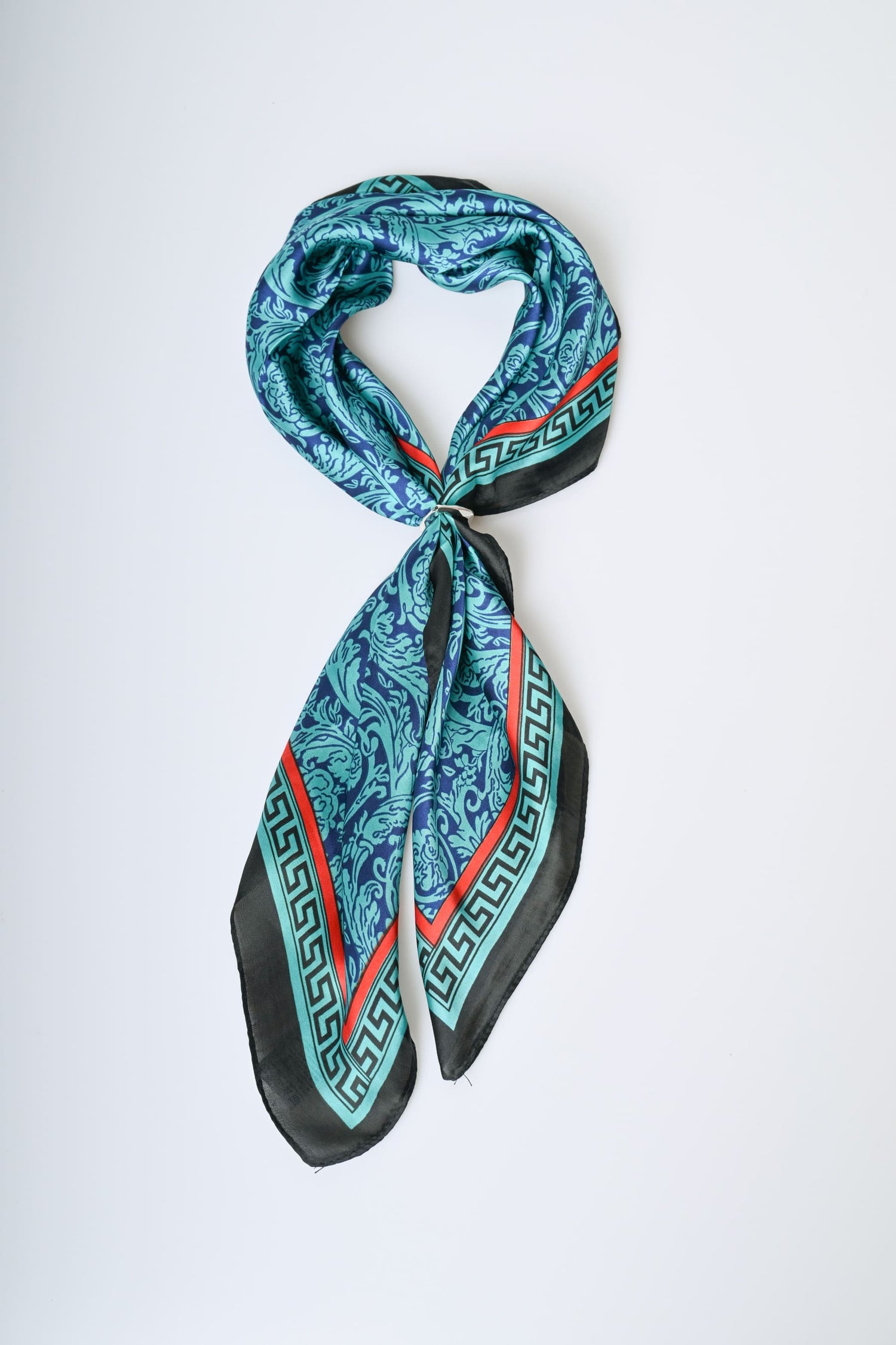 Foulard in raso a stampa floreale nei toni del turchese e blu con greca lungo i bordi e anello in metallo argentato.