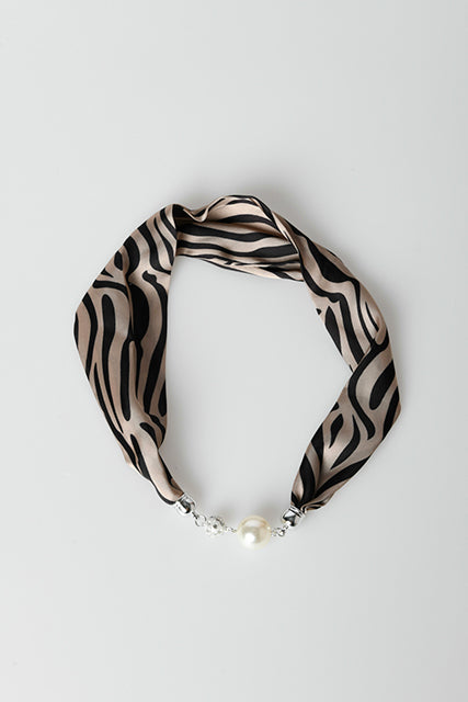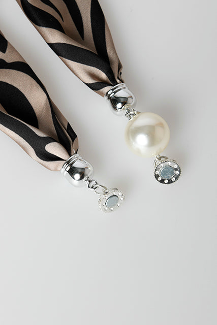 Foulard a stampa zebrata nera su fondo tortora con gancetto di chiusura e perla decorativa.