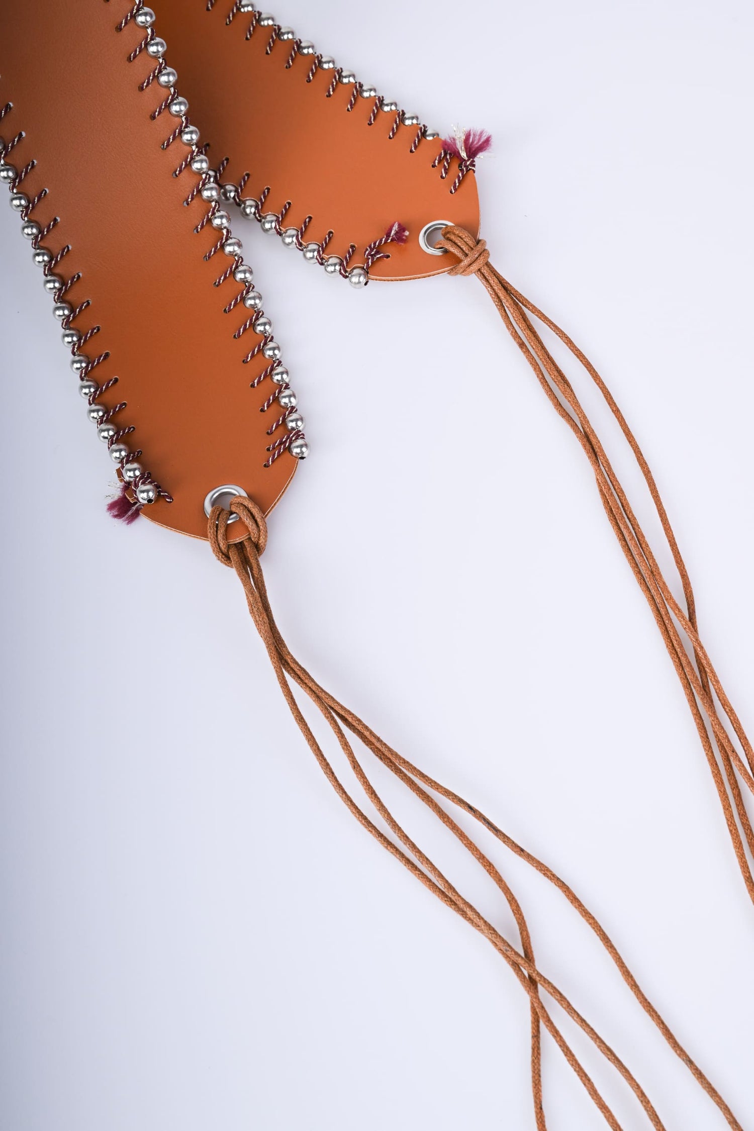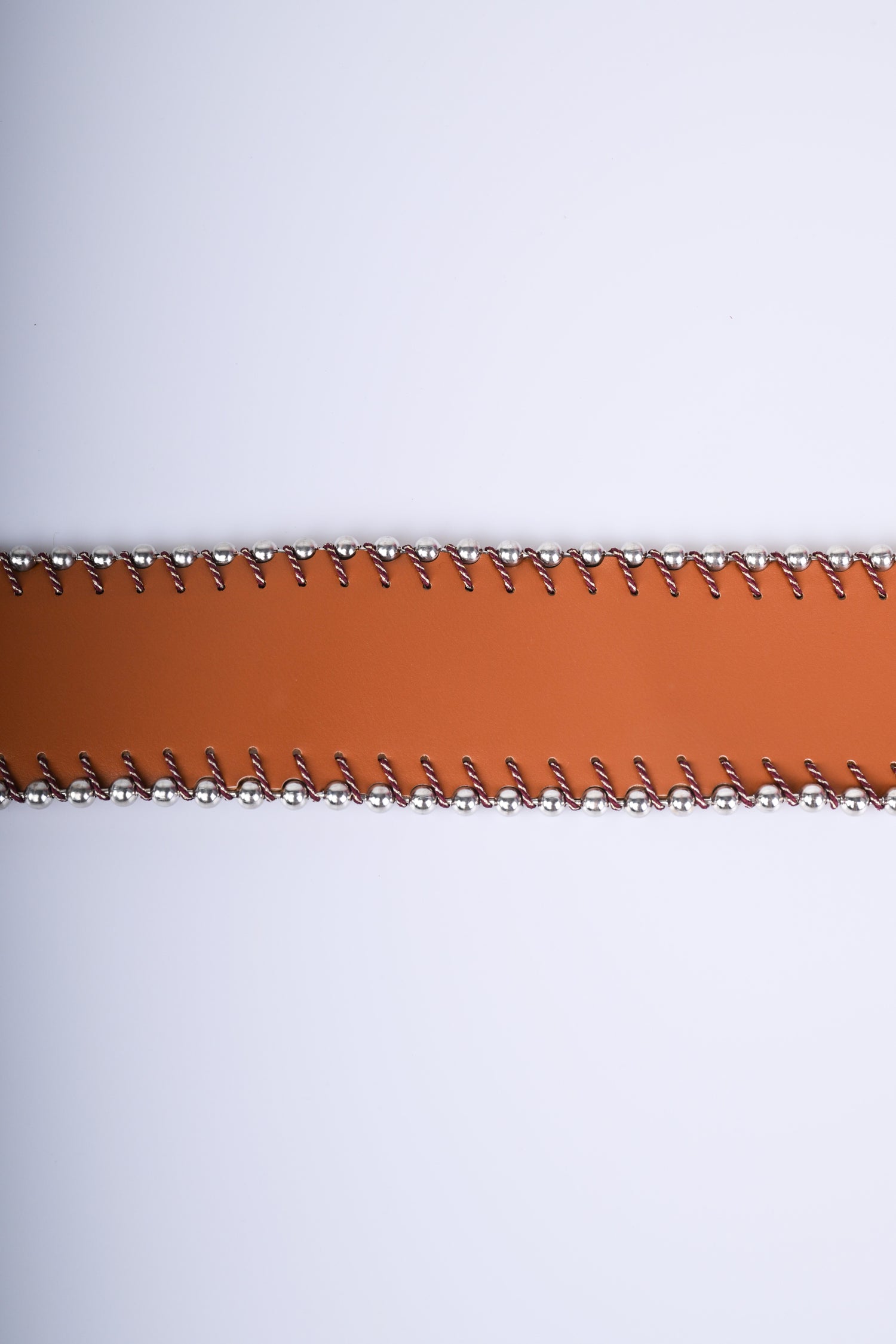Cintura a fascia in similpelle color cuoio con cinturini sottili multipli da annodare, perline argentate e nastrino multicolor lungo i bordi.