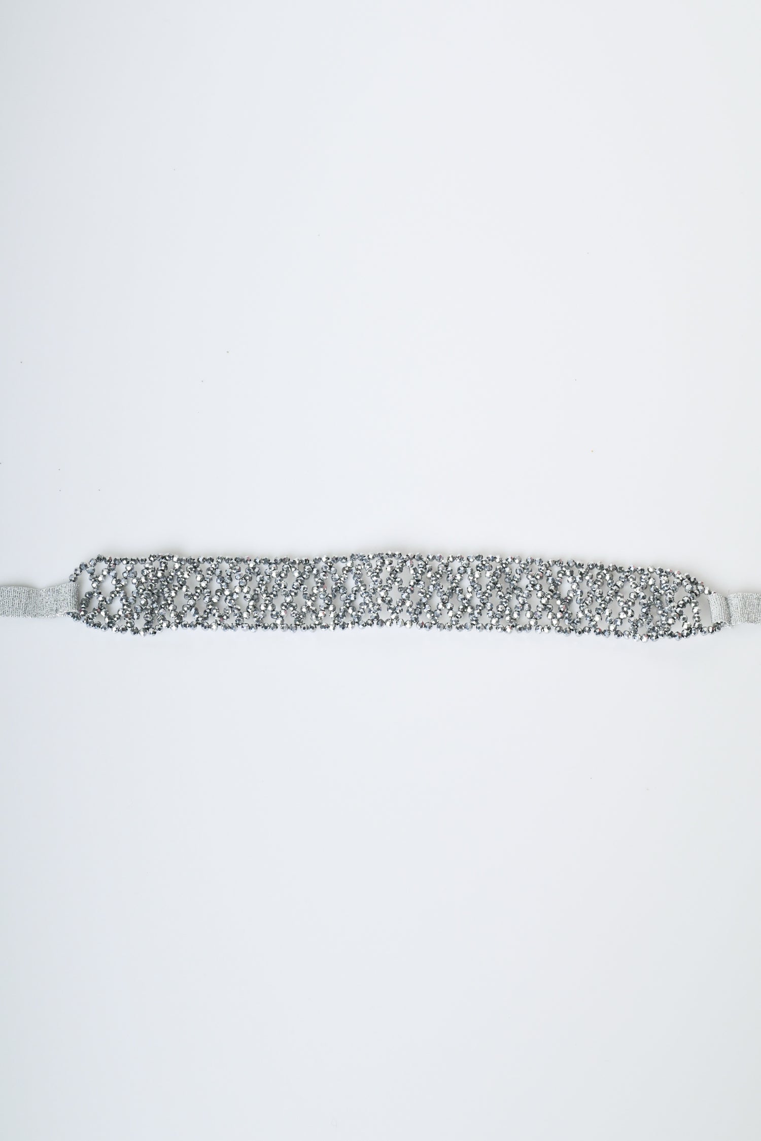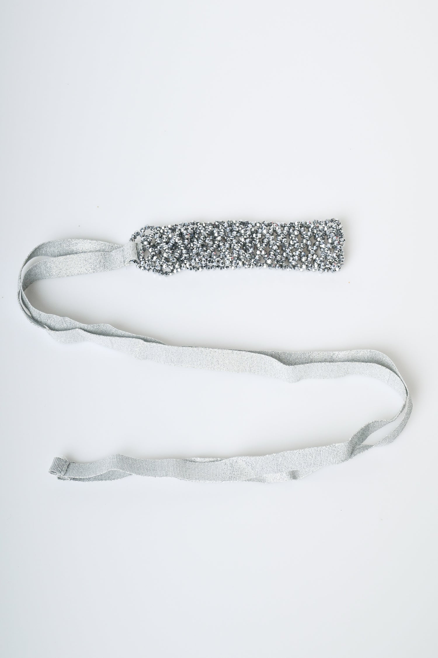 Cintura a fascia con parte centrale impreziosita da perline argentate e nastri in grosgrain da annodare.