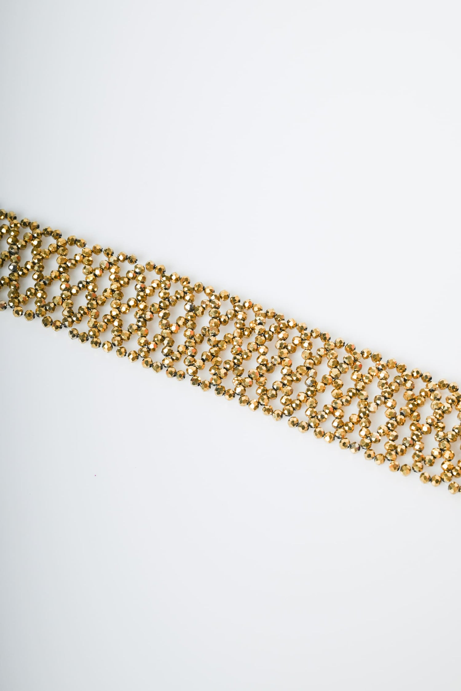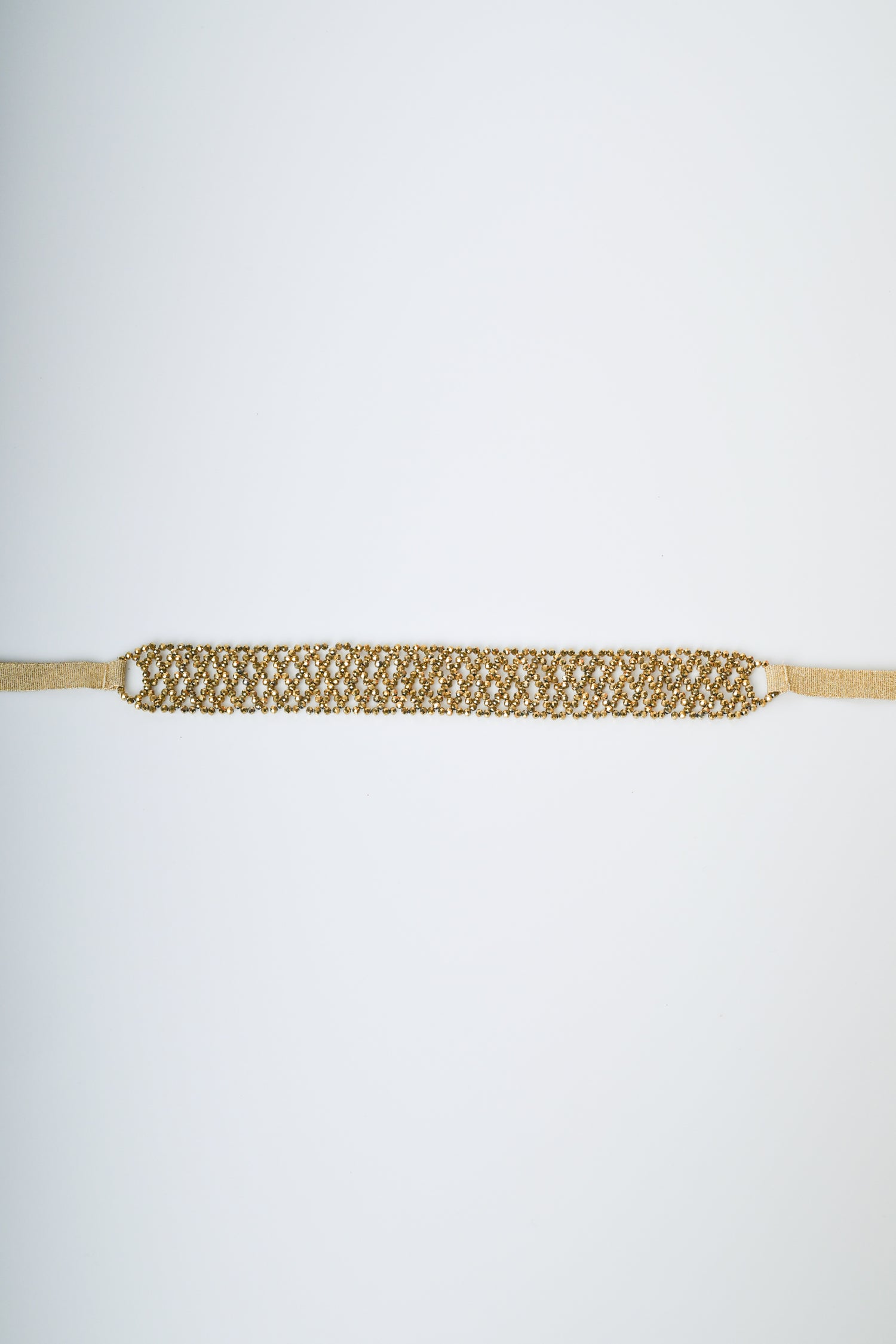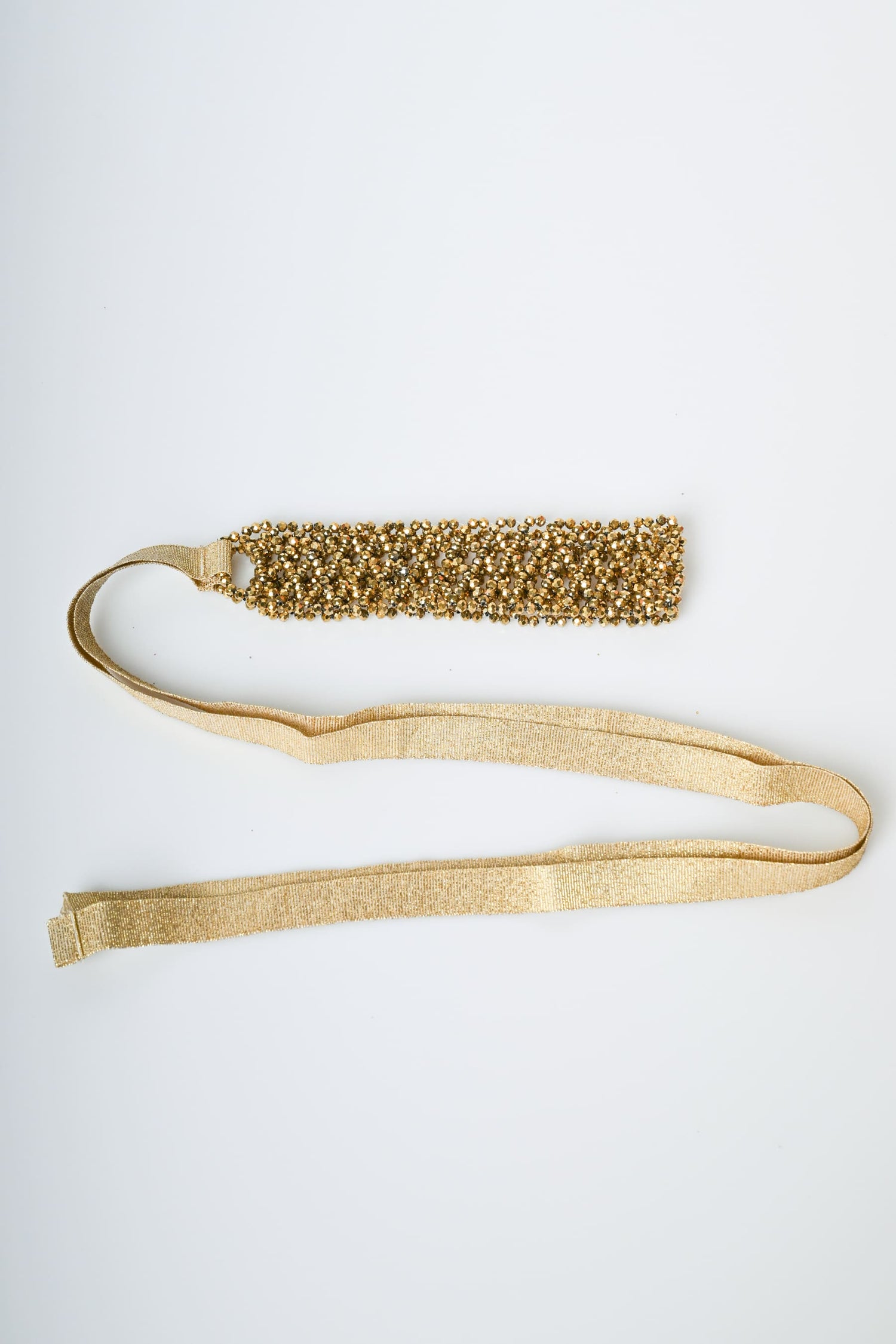 Cintura a fascia con parte centrale impreziosita da perline dorate e nastri in grosgrain da annodare.