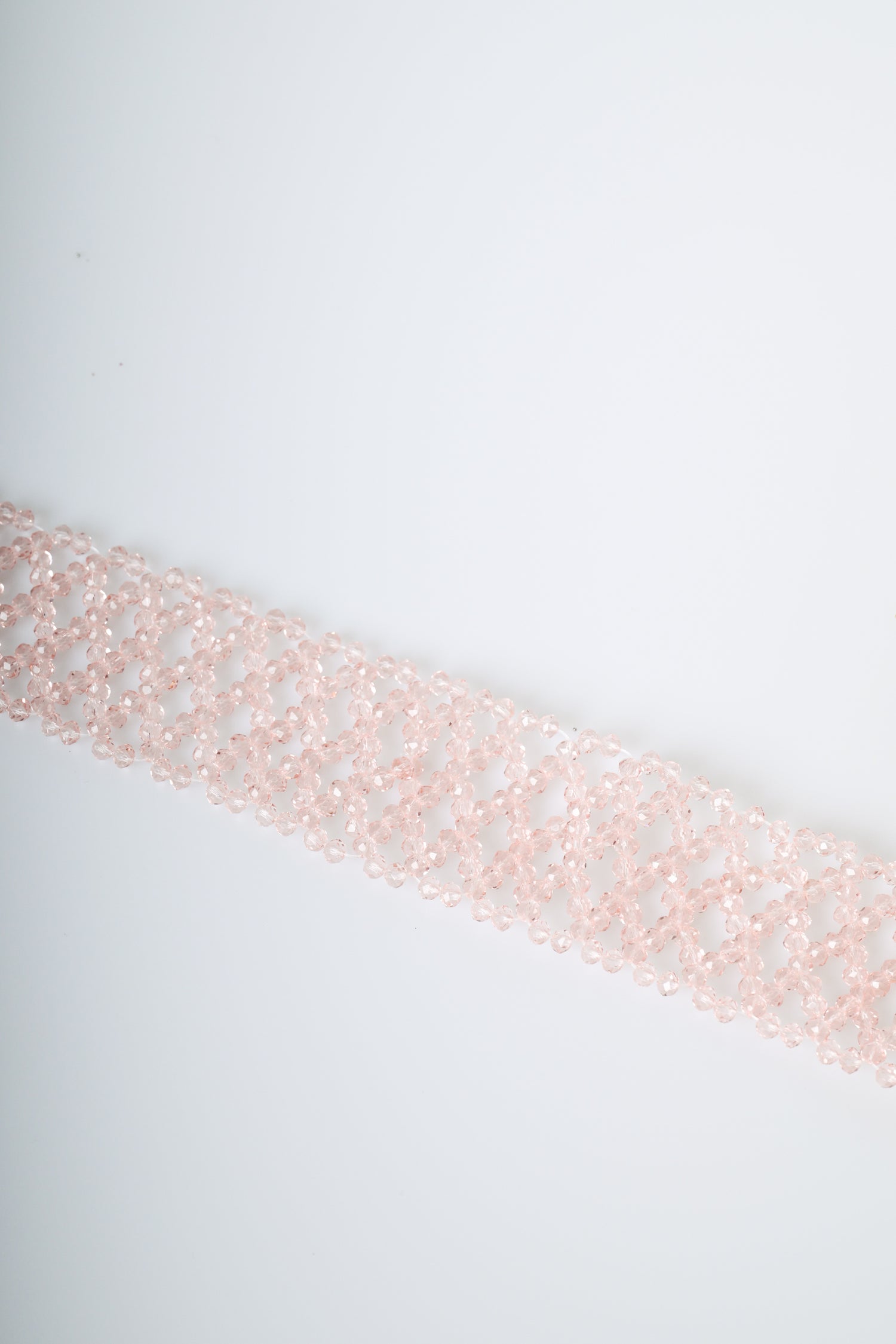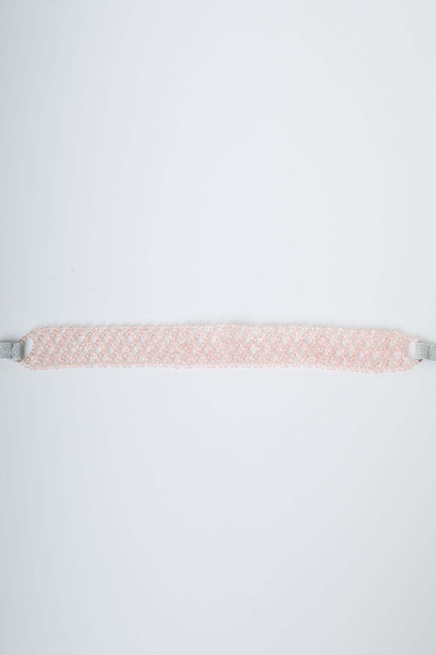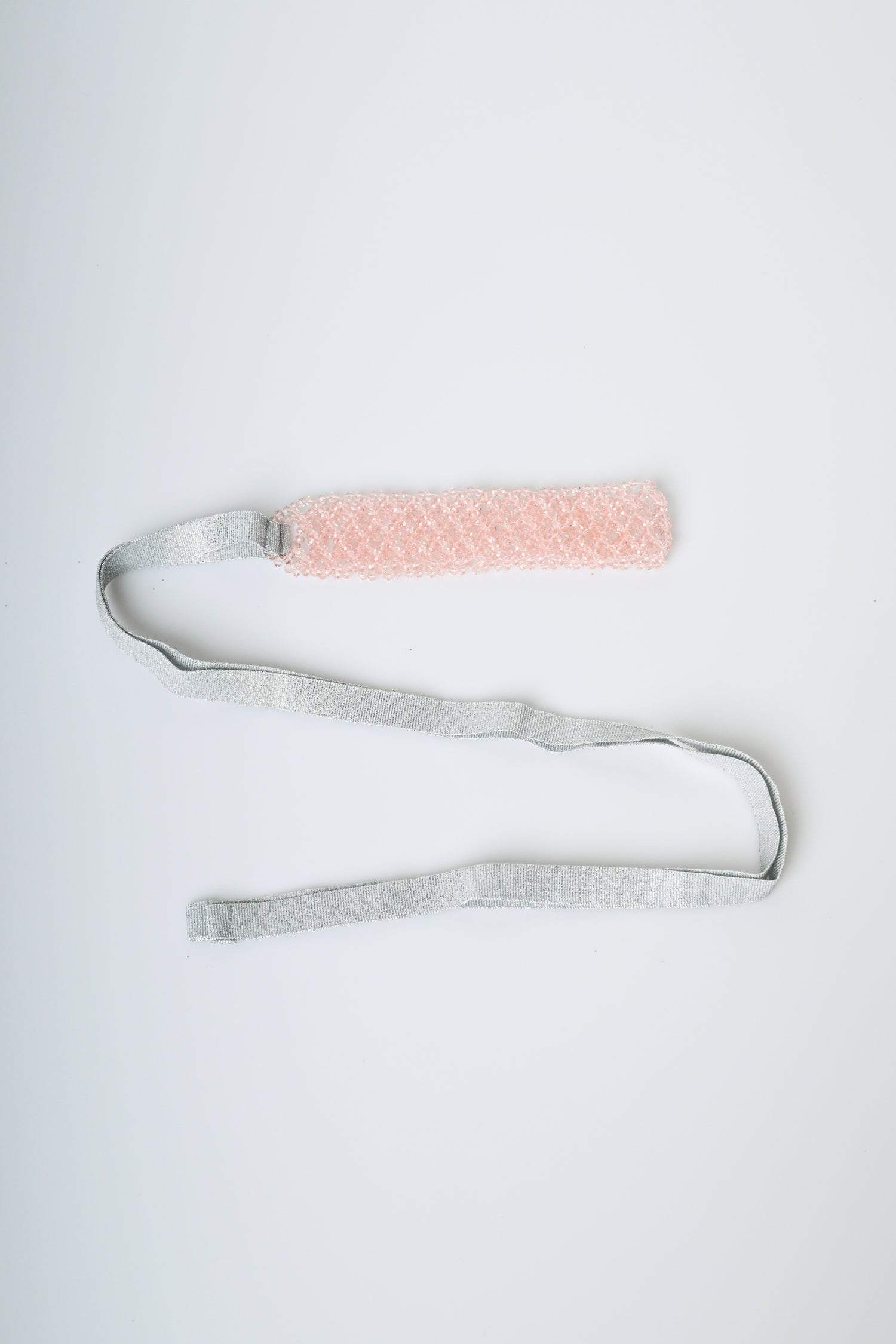 Cintura a fascia con parte centrale impreziosita da perline rosa e nastri in grosgrain argento da annodare.