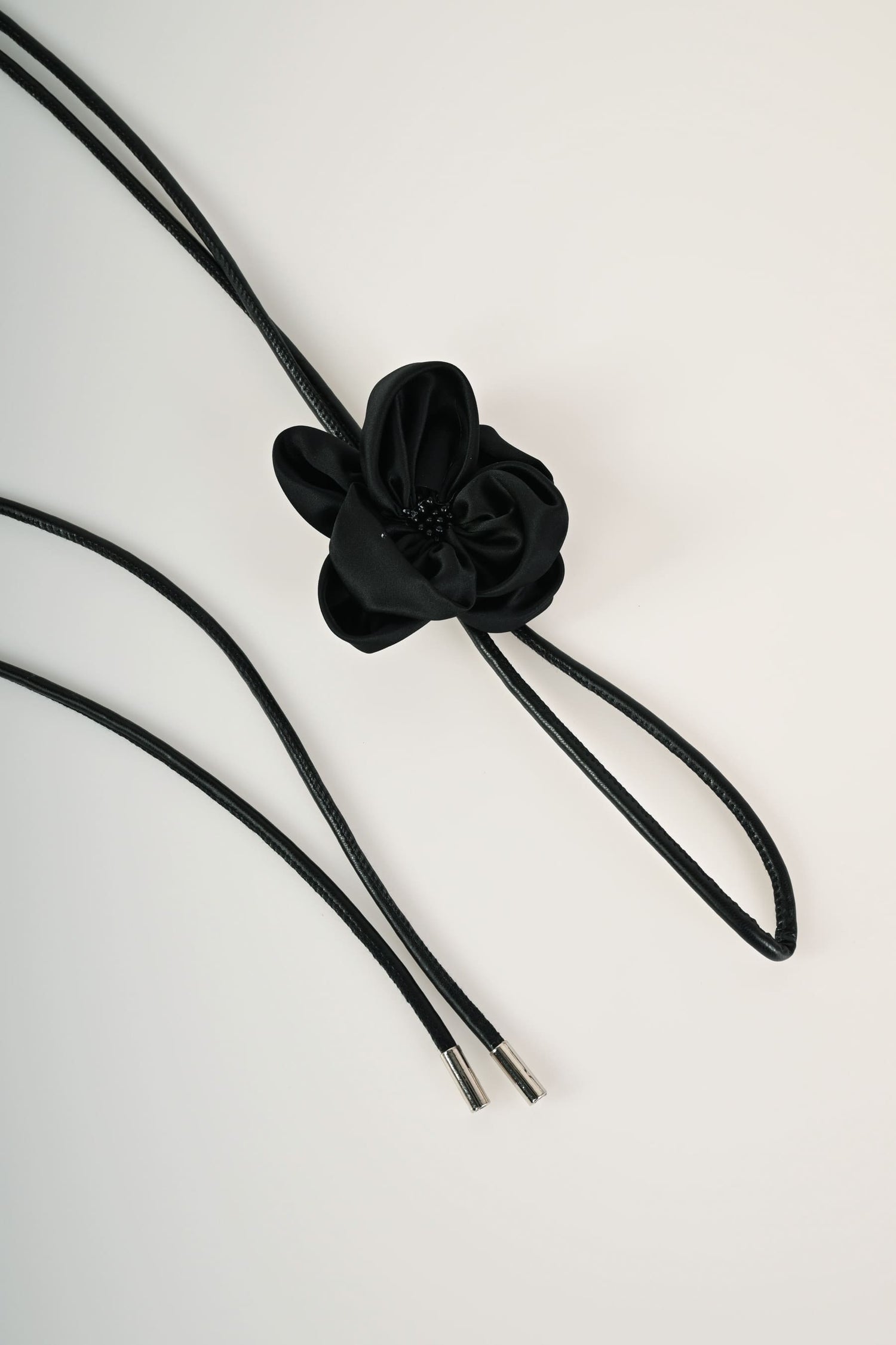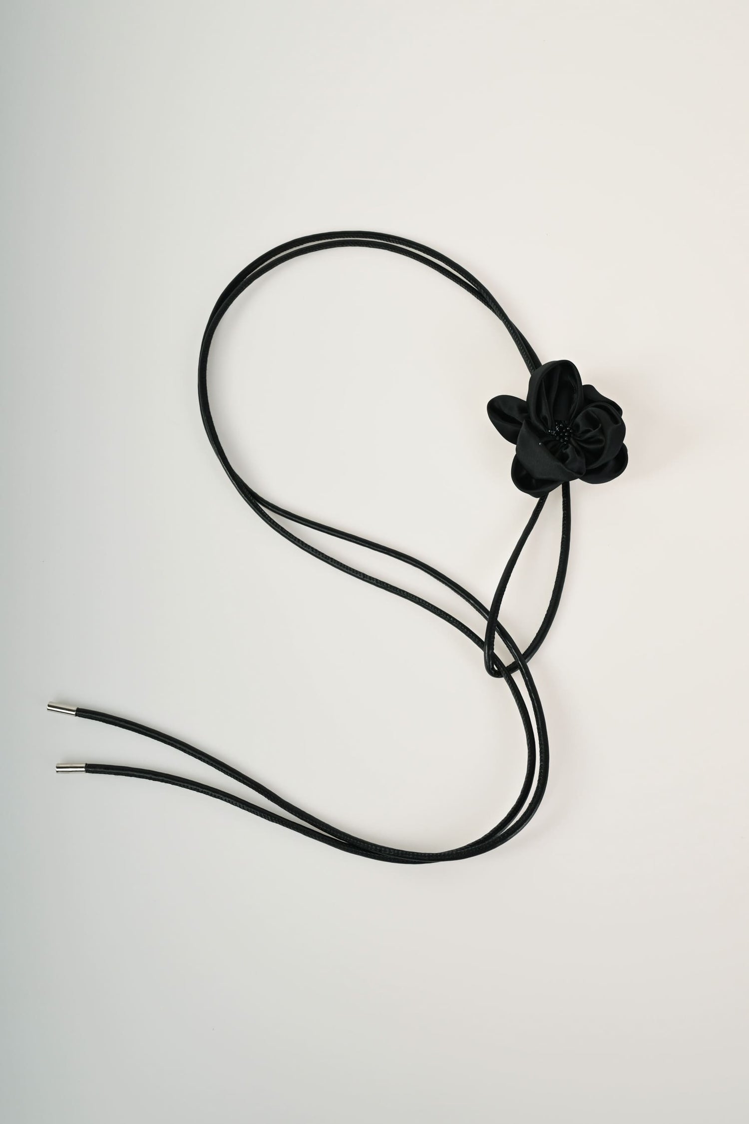 Cintura sottile in similpelle nera con fiore decorativo tono su tono e cappio.