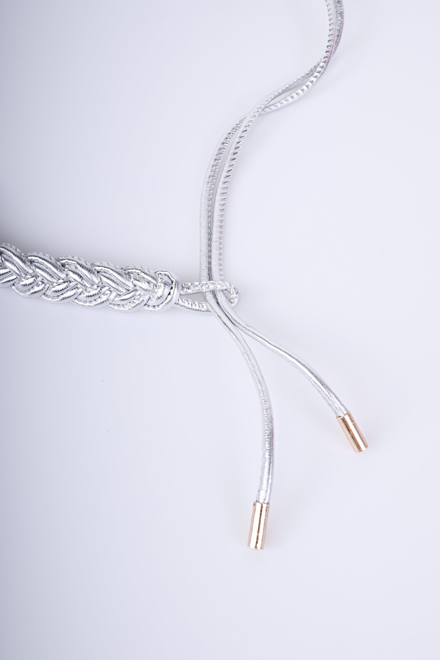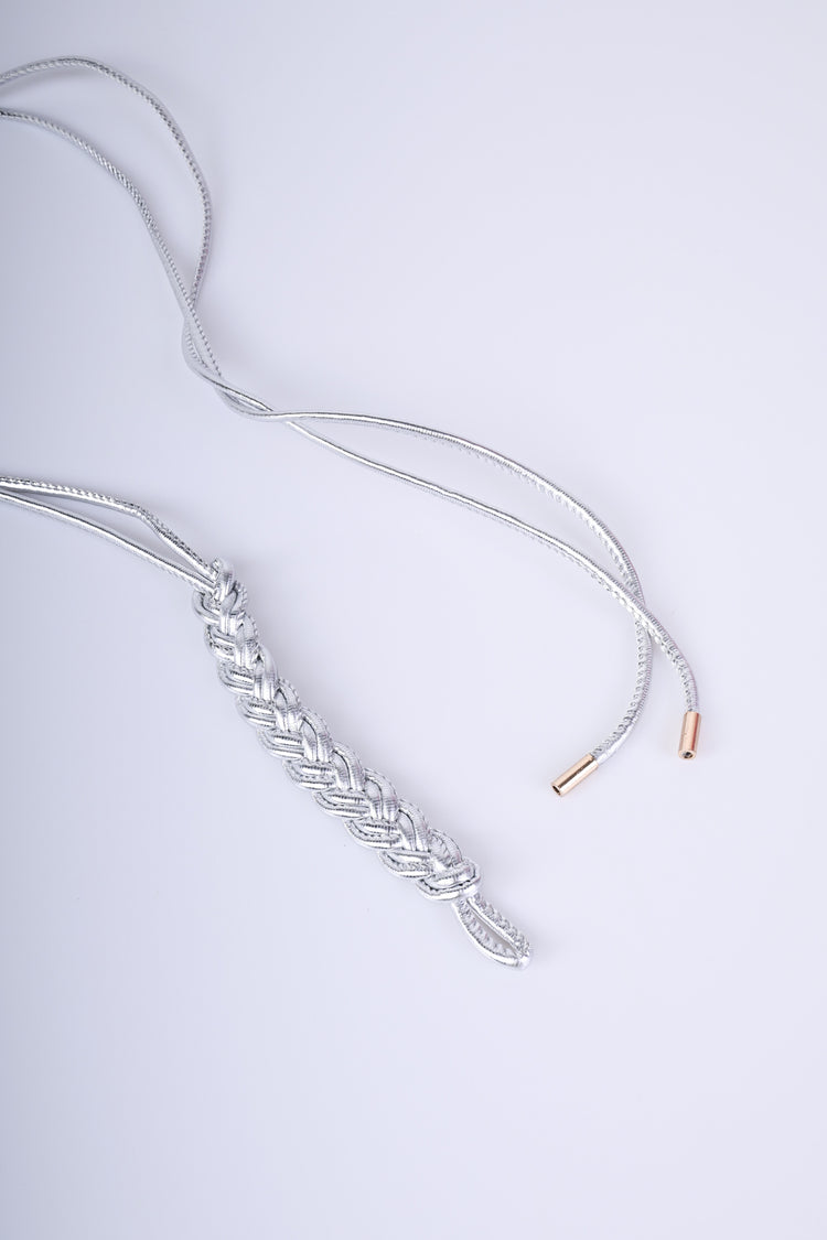 Cintura sottile a doppia corda in similpelle argentata con parte a intreccio e hardware in metallo dorato.