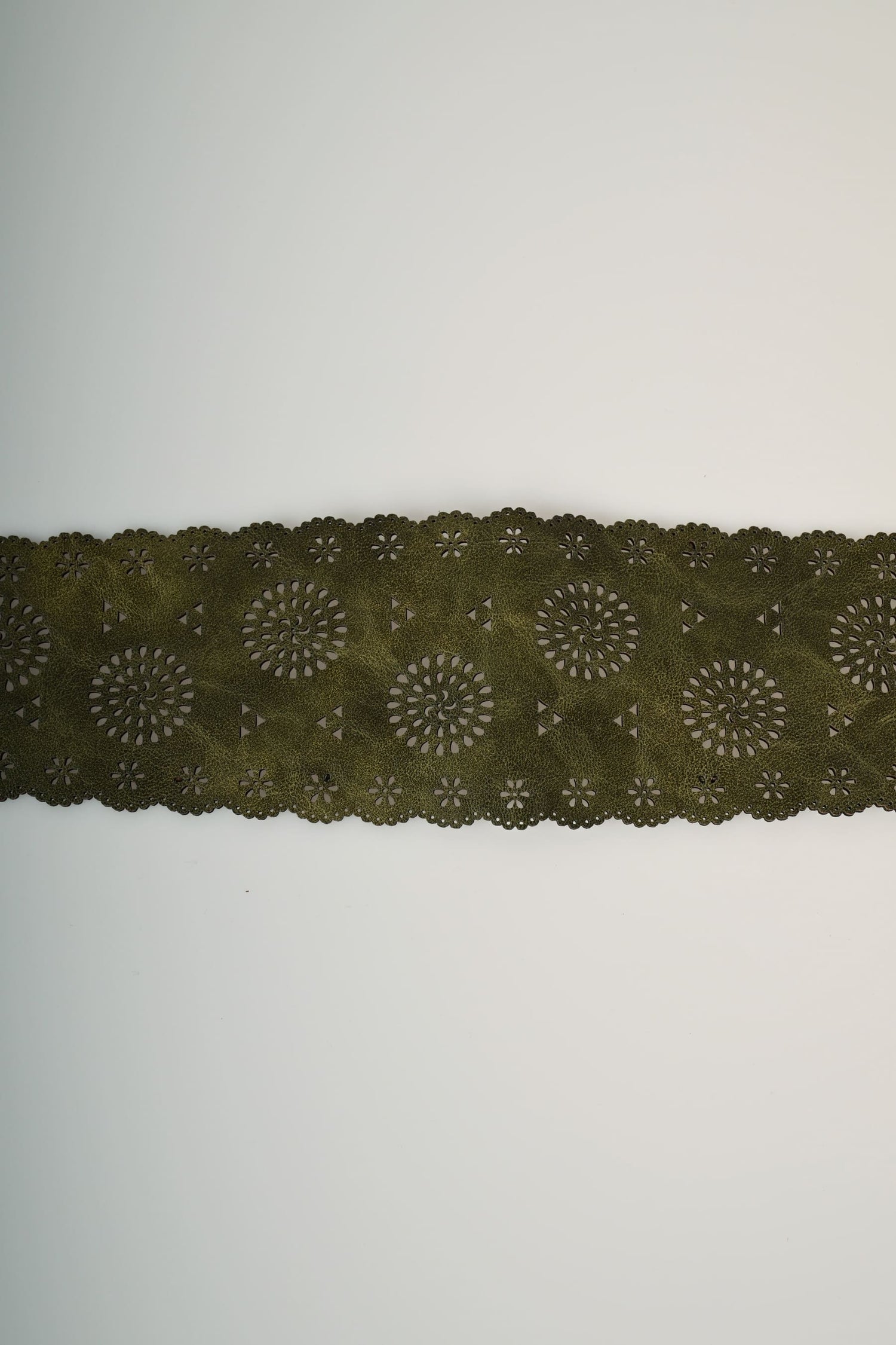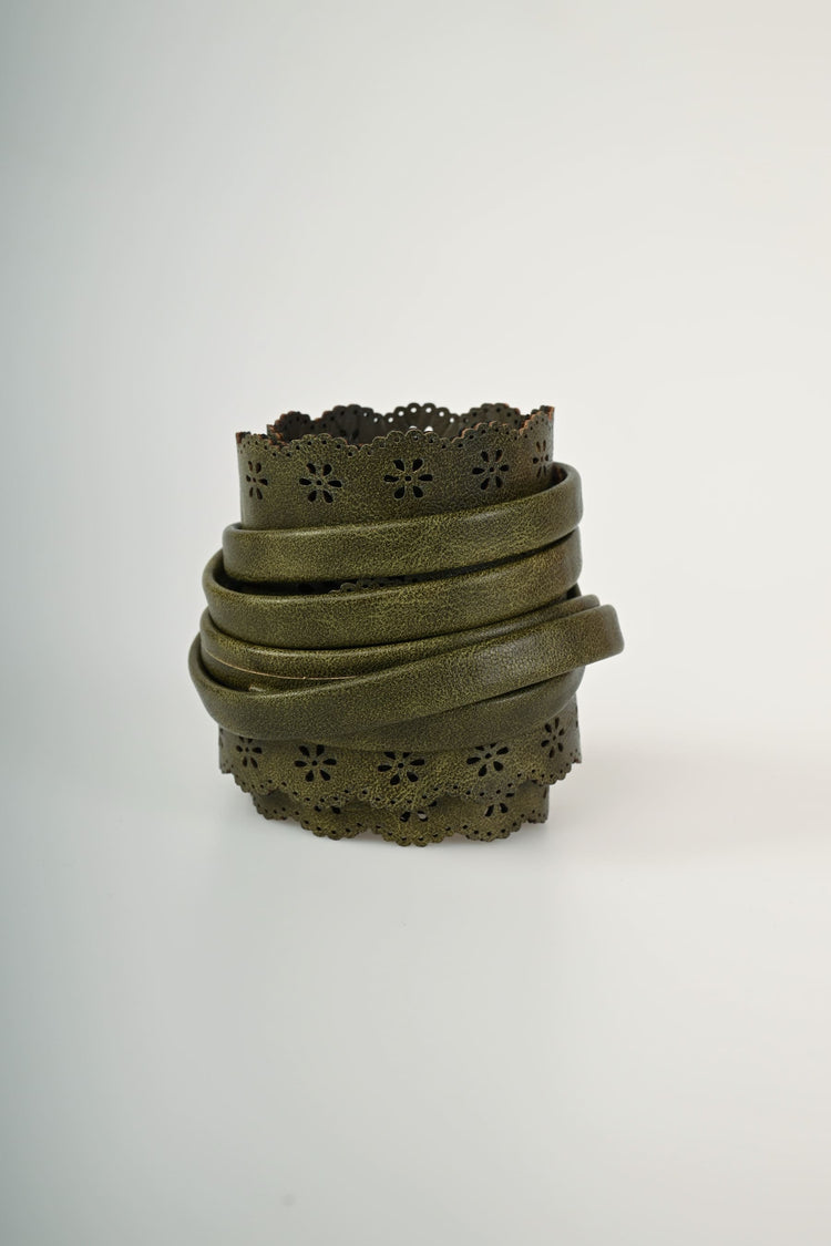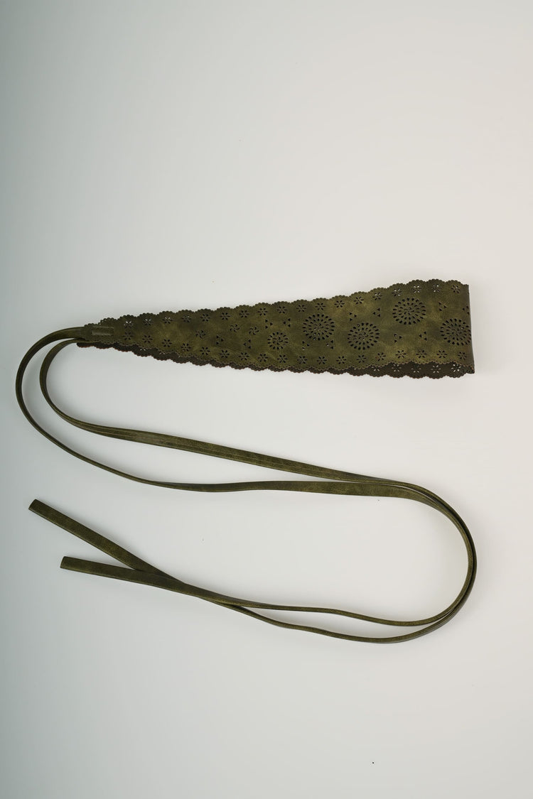 Cintura a fascia in similpelle verde oliva con motivo traforato, bordi ondulati e cinturini sottili da annodare.