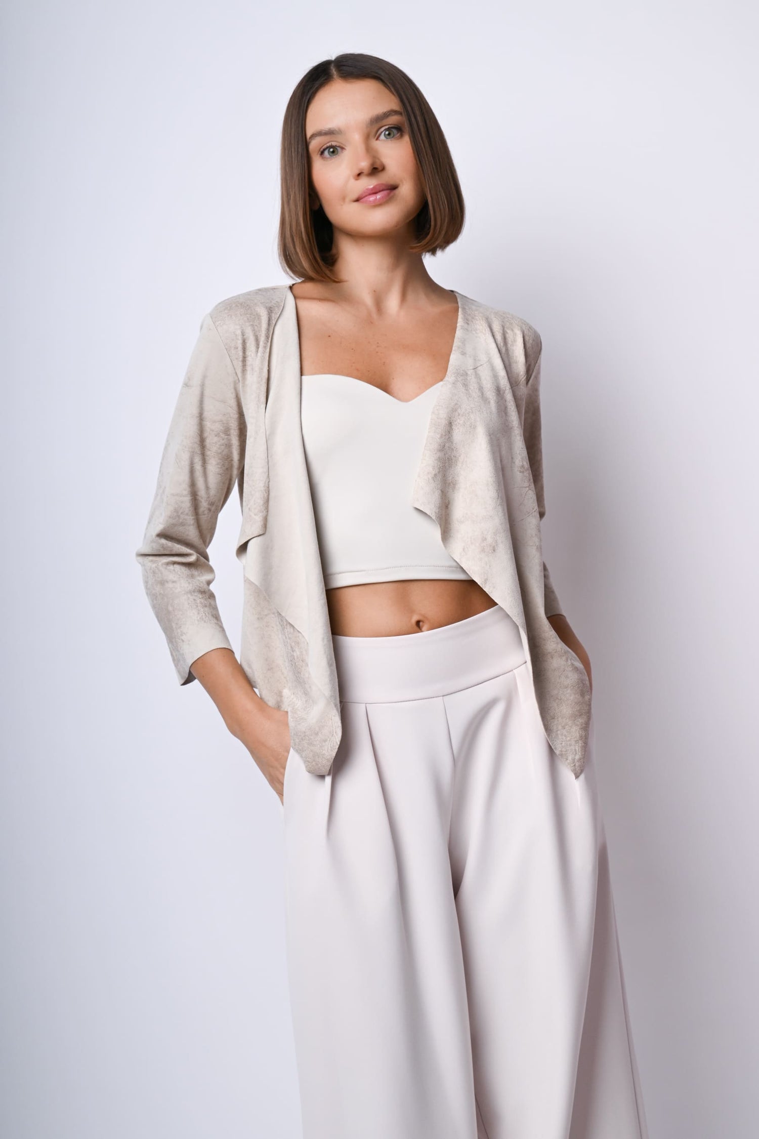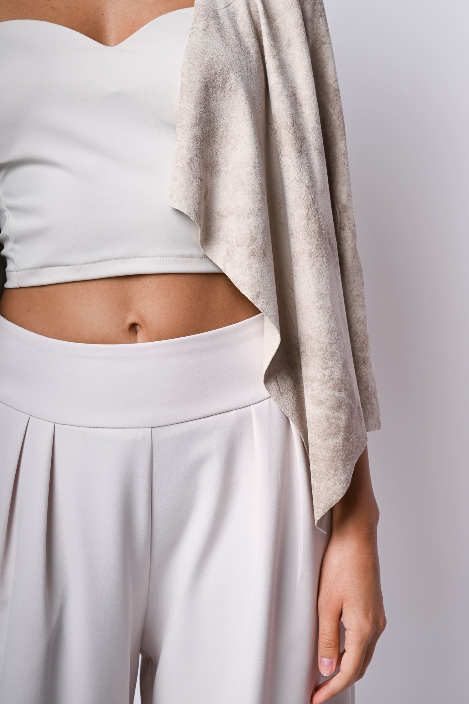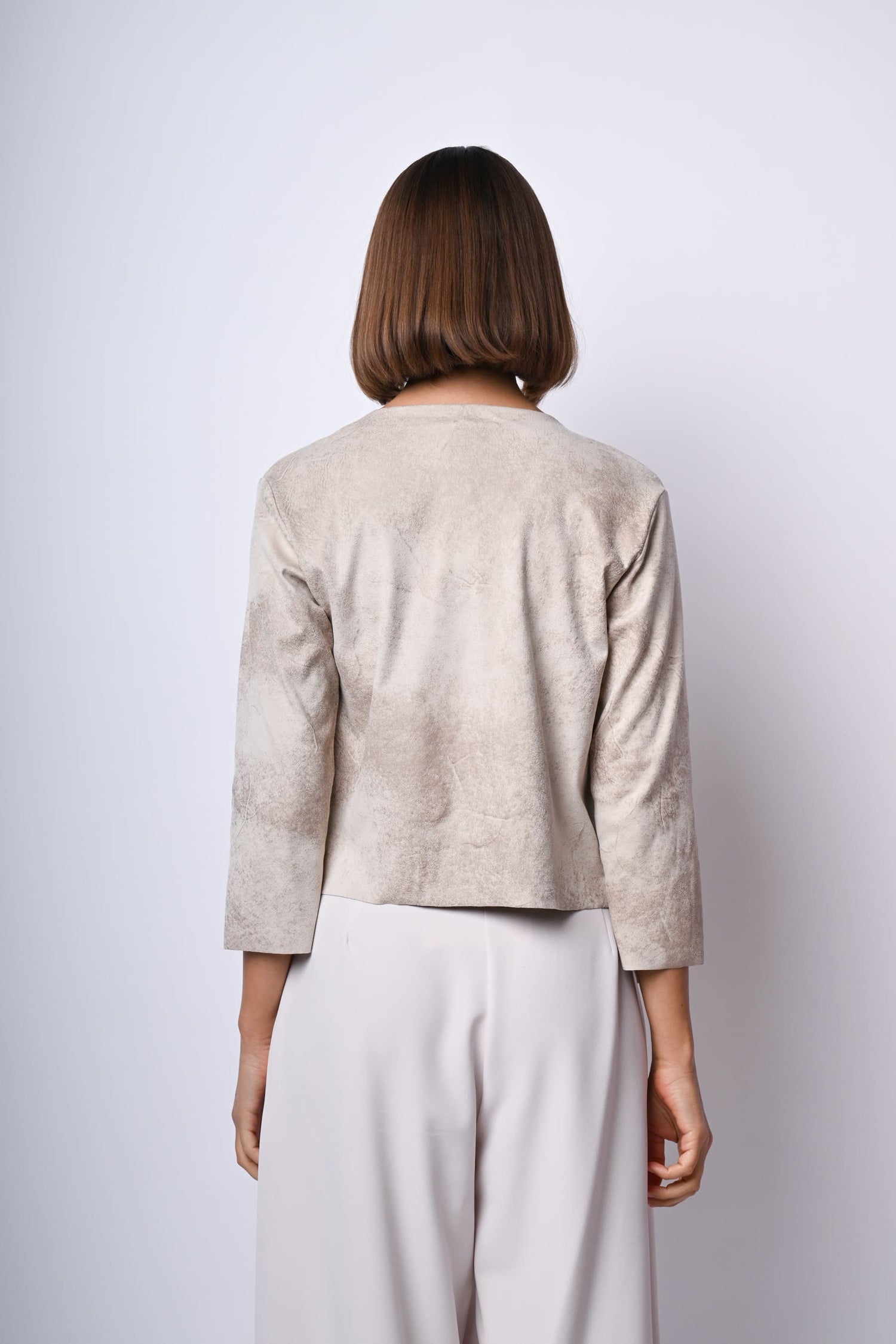 Giacca morbida in similpelle scamosciata bianca effetto vintage, revers squadrati fluenti, nessuna chiusura e maniche crop.