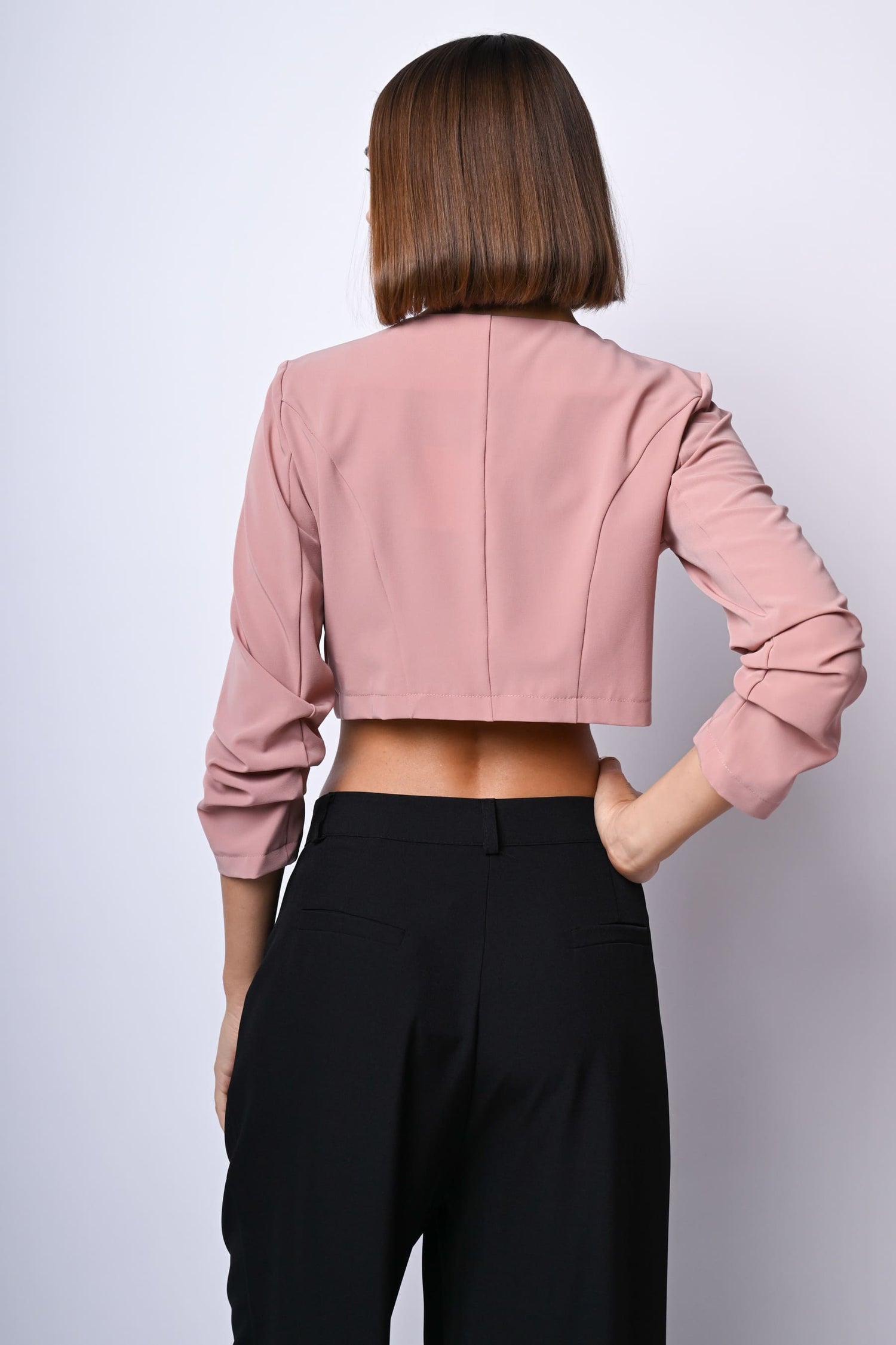 Giacca crop in tessuto stretch rosa con scollo tondo, chiusura con due bottoni, maniche tre quarti arricciate e orlo stondato.