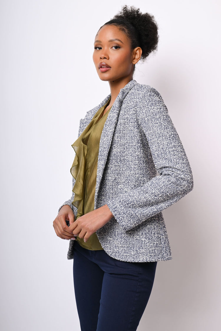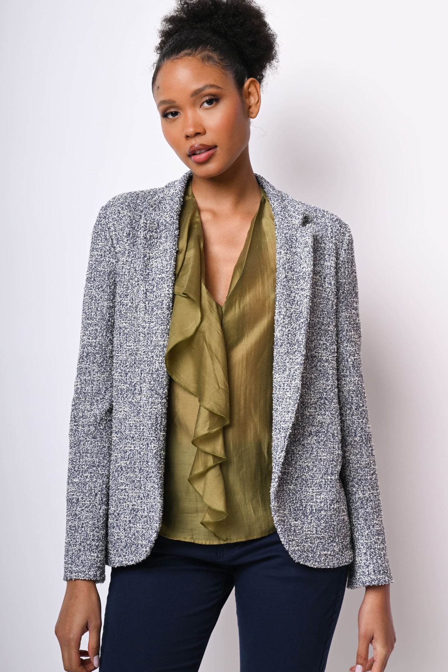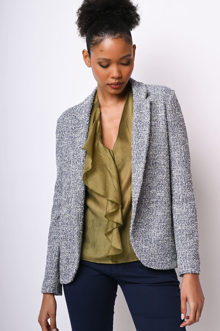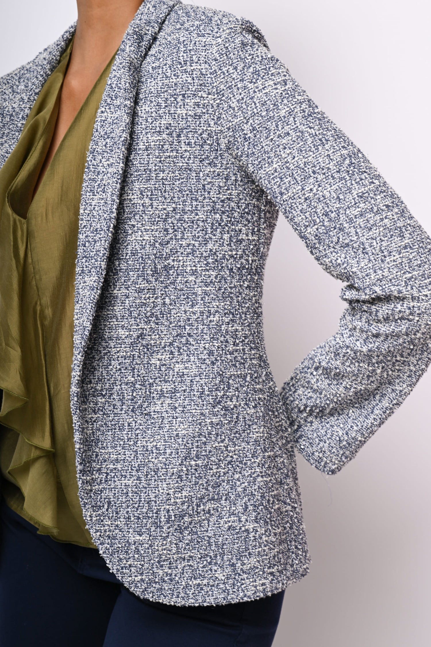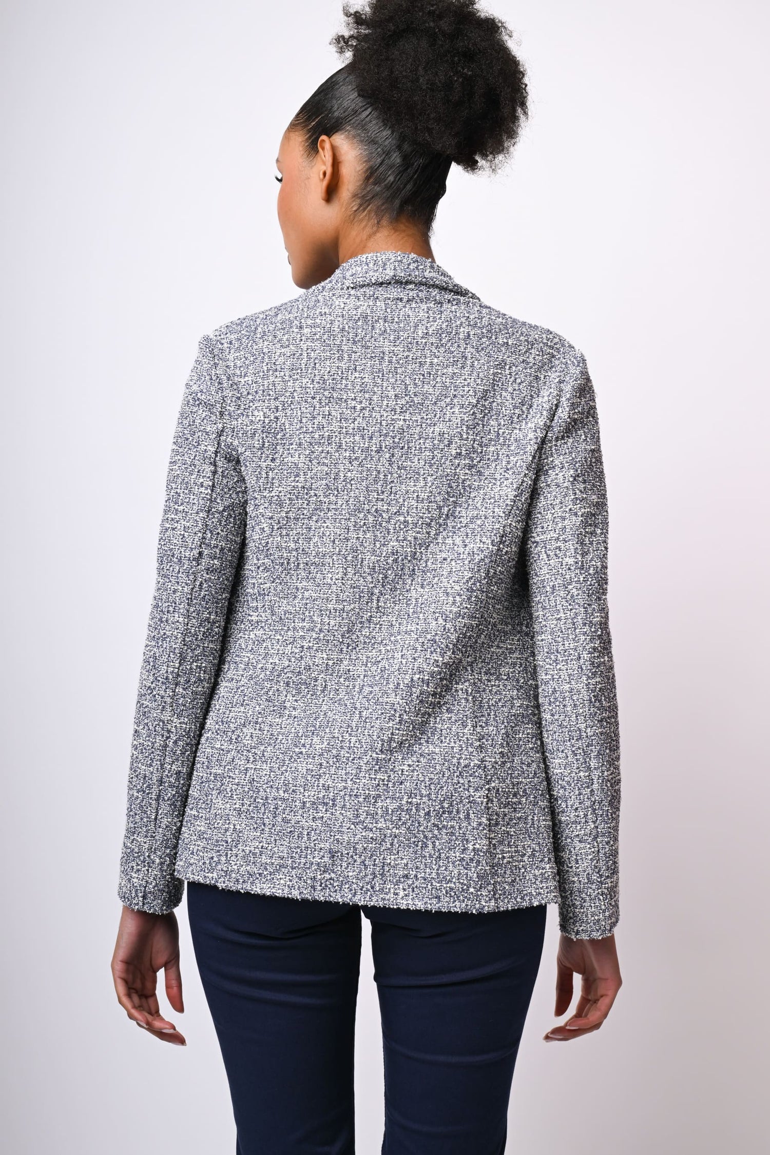 Blazer in maglia bouclé misto viscosa e cotone nei toni del blu e bianco con revers classici e nessuna chiusura.